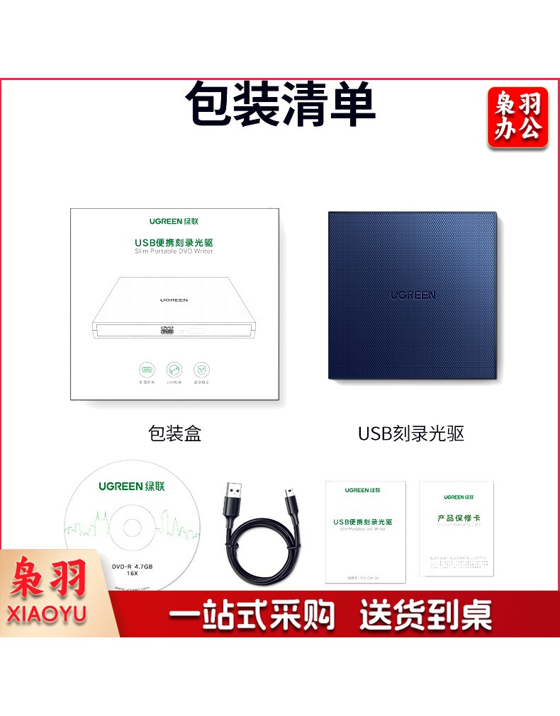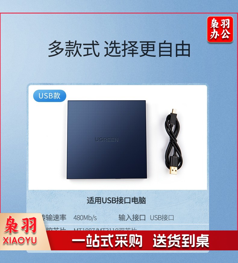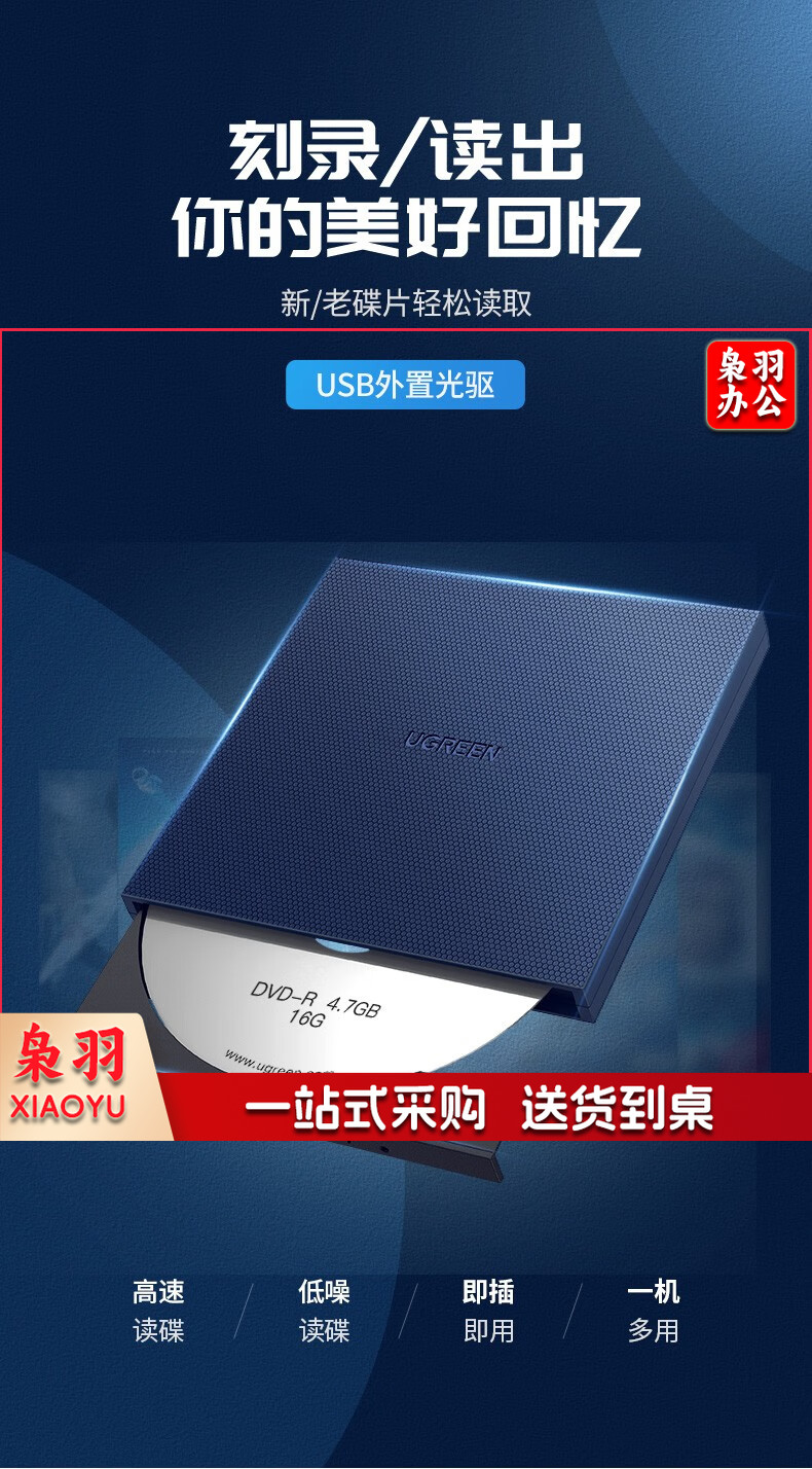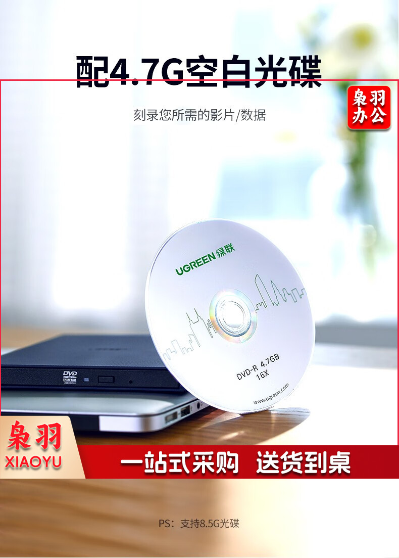 绿联(UGREEN)40576 外置光驱盘USB-C接台式Type-C笔记本电脑刻录机DVD/CD/VCD通用8/CD24倍速 USB款 免装驱动