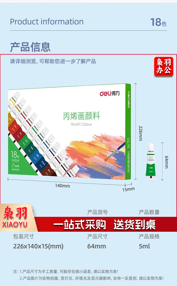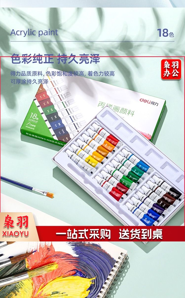 得力/deli DL-73914 丙烯颜料 18色5ml初学入门套装 画画丙烯画改鞋写生黑板报墙绘手绘儿童成人美术绘画