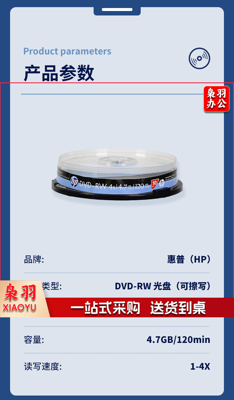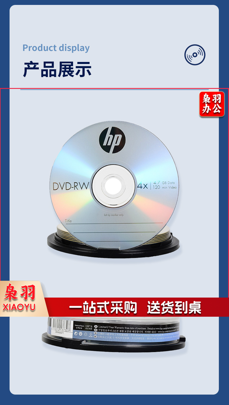 惠普(HP) DVD-RW可擦写 光盘/刻录盘 空白光盘 4速4.7GB 桶装10片