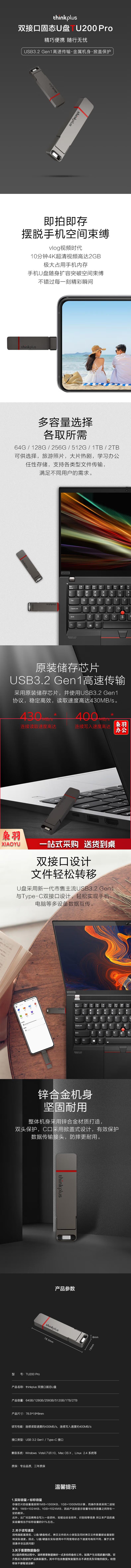 ThinkPad 联想thinkplus双接口固态U盘USB3.2/Type-C高速传输U盘金属商务 TU200 Pro【512G】