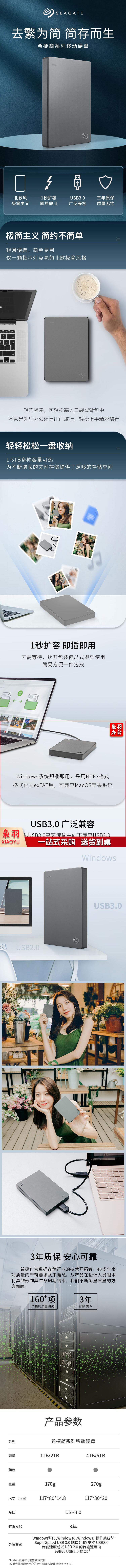 希捷(Seagate)移动硬盘 2TB/2T USB3.0简2.5英寸