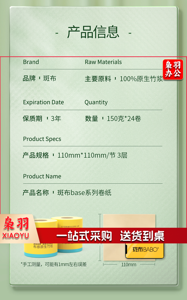 斑布本色卫卷纸 BASE系列 3层150g有芯卷纸*24卷箱装