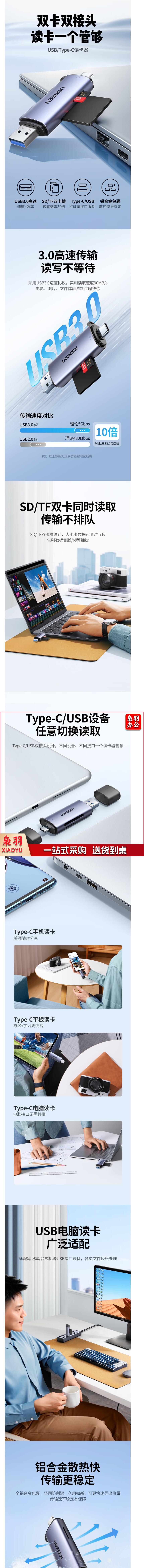 绿联 USB 3.0 Type-C铝合金读卡器 货号:YC