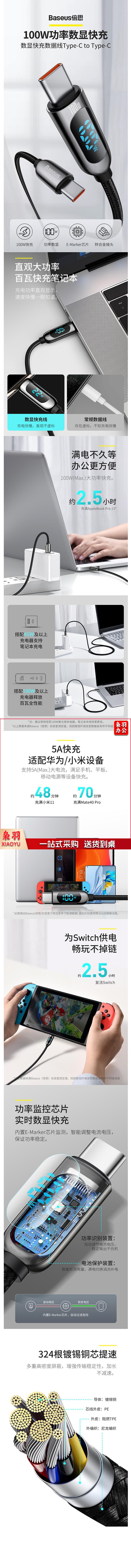 倍思 双头Type-C数据线 PD100W快充 智能数显 1米黑 货号:YC