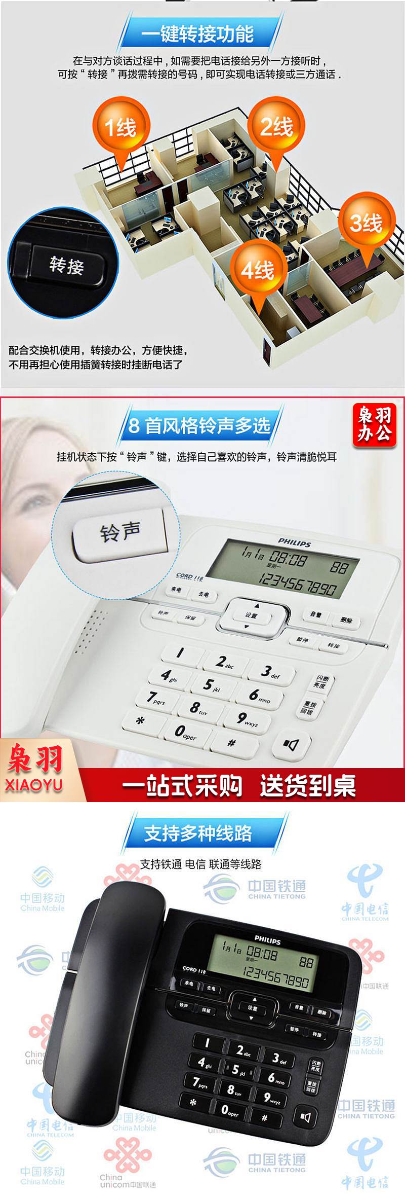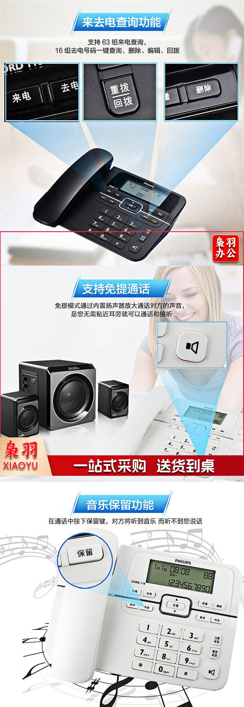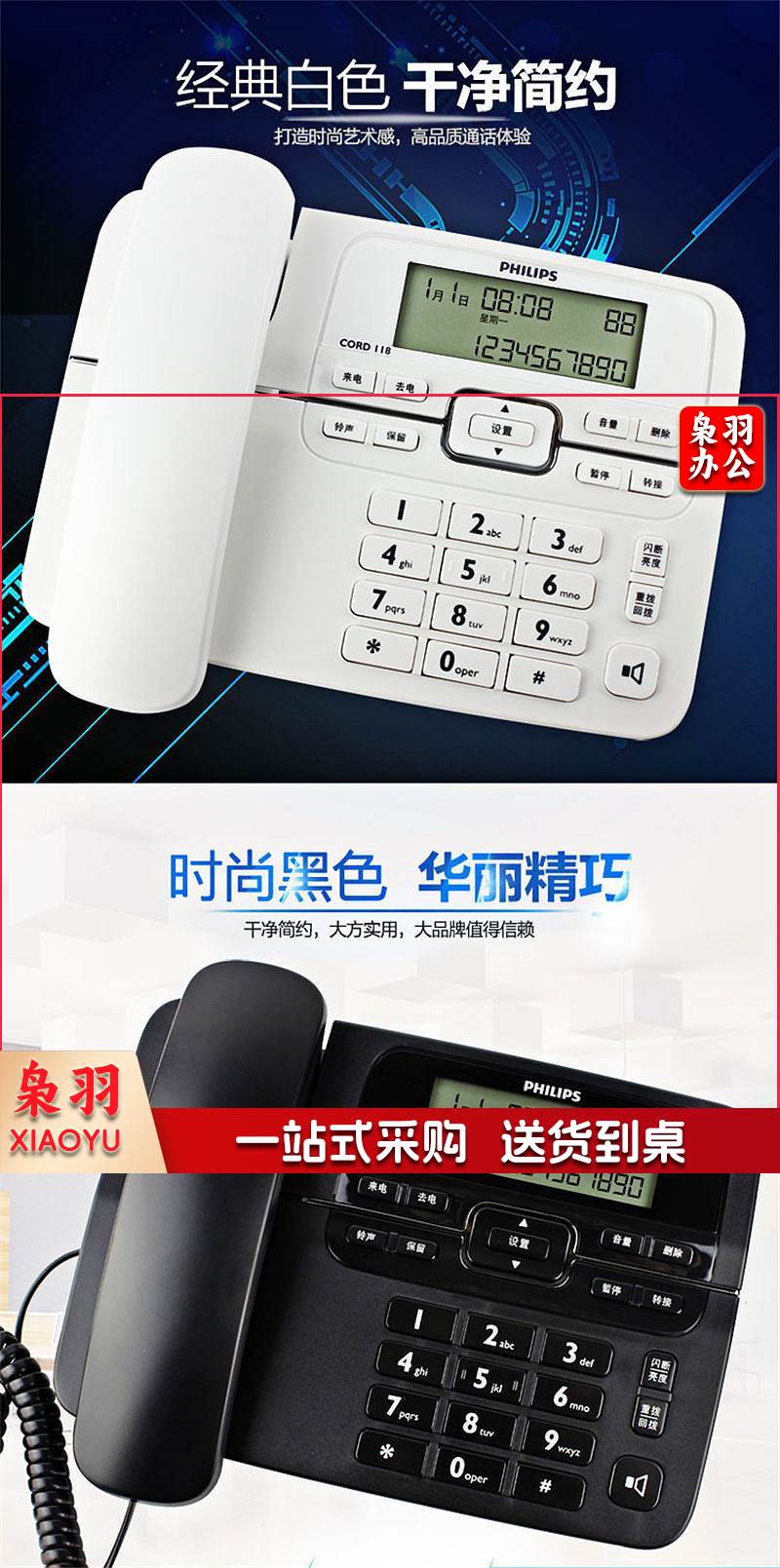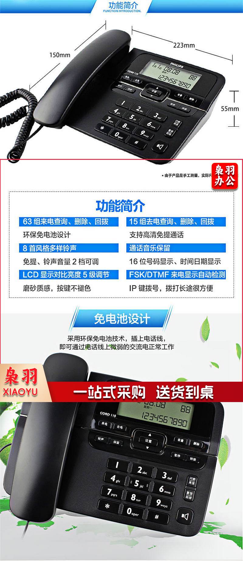 飞利浦 CORD118 电话机 来电显示 双接口 免电池 黑色