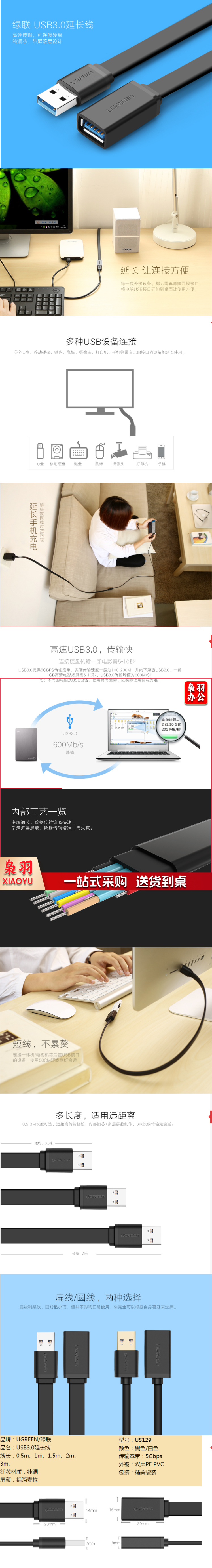 绿联(UGREEN)USB3.0延长线公对母 USB3.0数据线 电脑USB 鼠标键盘加长线 2米 黑色