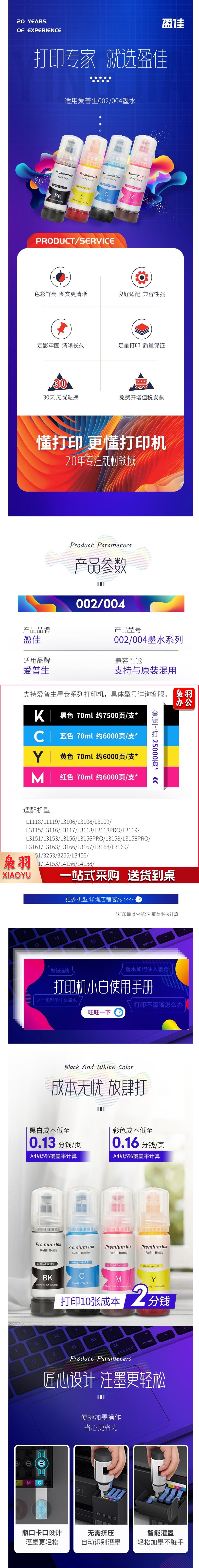 盈佳 爱普生002/004 四色墨水套装 适用 L3153 L3151 L1119 L3118 L3119 L3168 L3158 L1118 L5198 L3166
