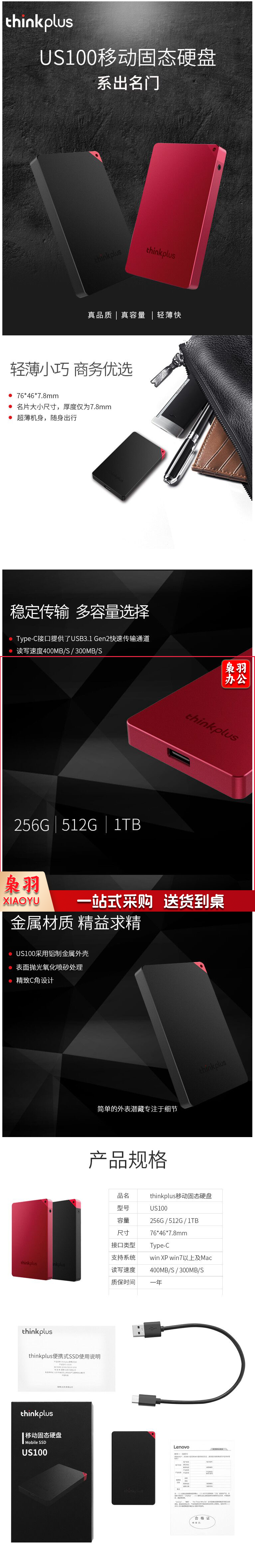 联想(Lenovo)移动固态硬盘 USB3.2高速PSSD移动硬盘小巧便携读取400MB/S US100 黑色 1T