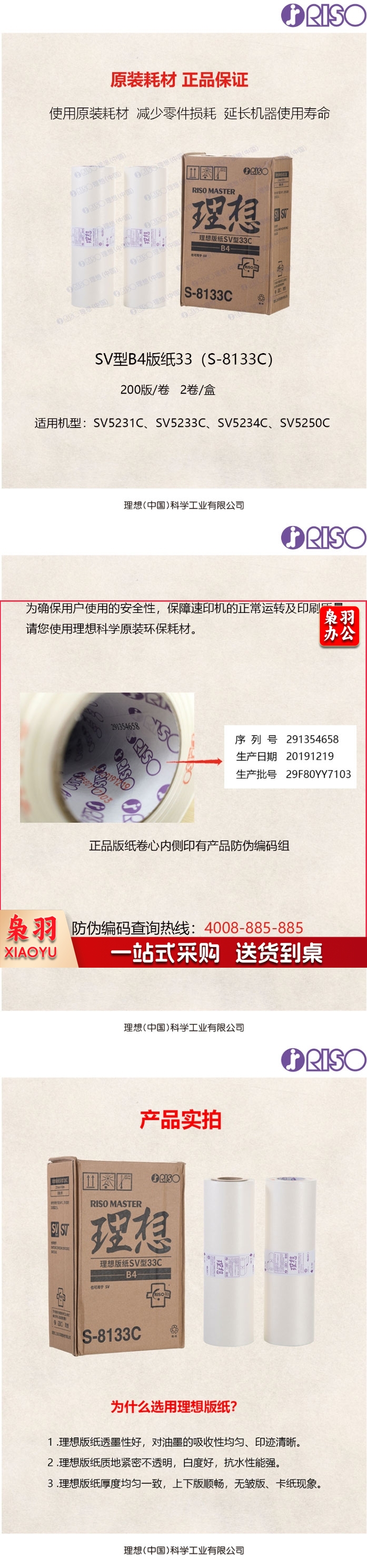 理想 RISO SV型B4版纸33(S-8133C)适用于:SV B4机型 一卷装