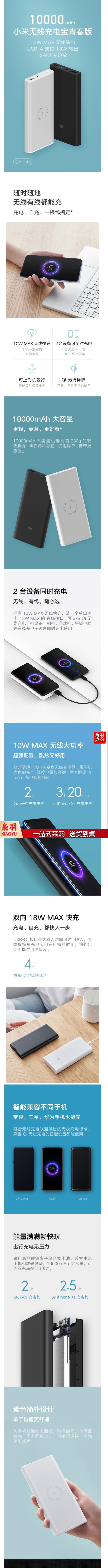 小米无线充电宝青春版 原装10000毫安时 10WMAX无线输出 黑色 内含数据线适用小米10苹果安卓redmi手机充电宝