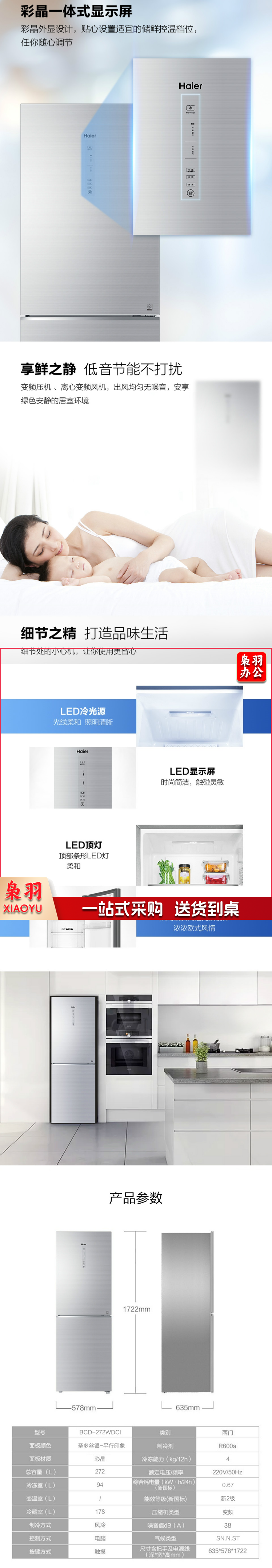 海尔 272升双门冰箱 高配双变频两门风冷无霜 彩晶一体式显示屏 电脑控温BCD-272WDCI
