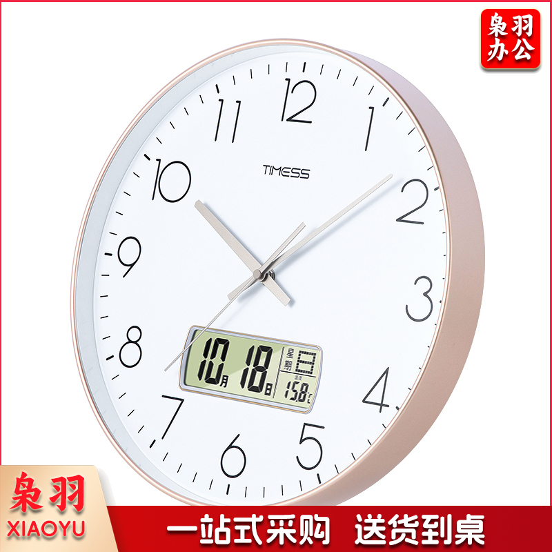 Timess液晶显示万年历挂钟客厅卧室圆形钟表家用免打孔时钟时尚创意简约扫秒机芯石英钟 P26-2金边白面35厘米