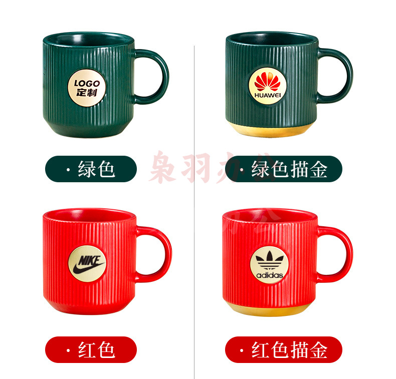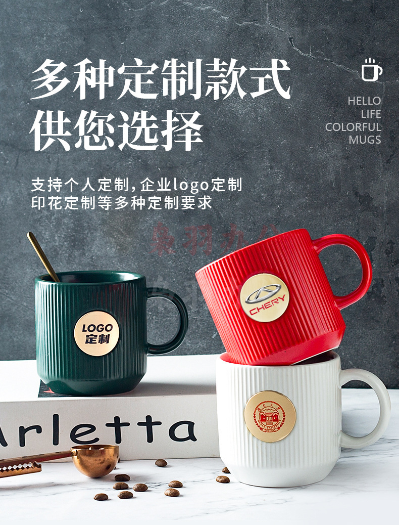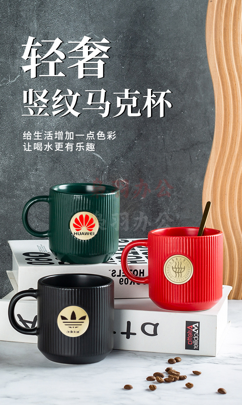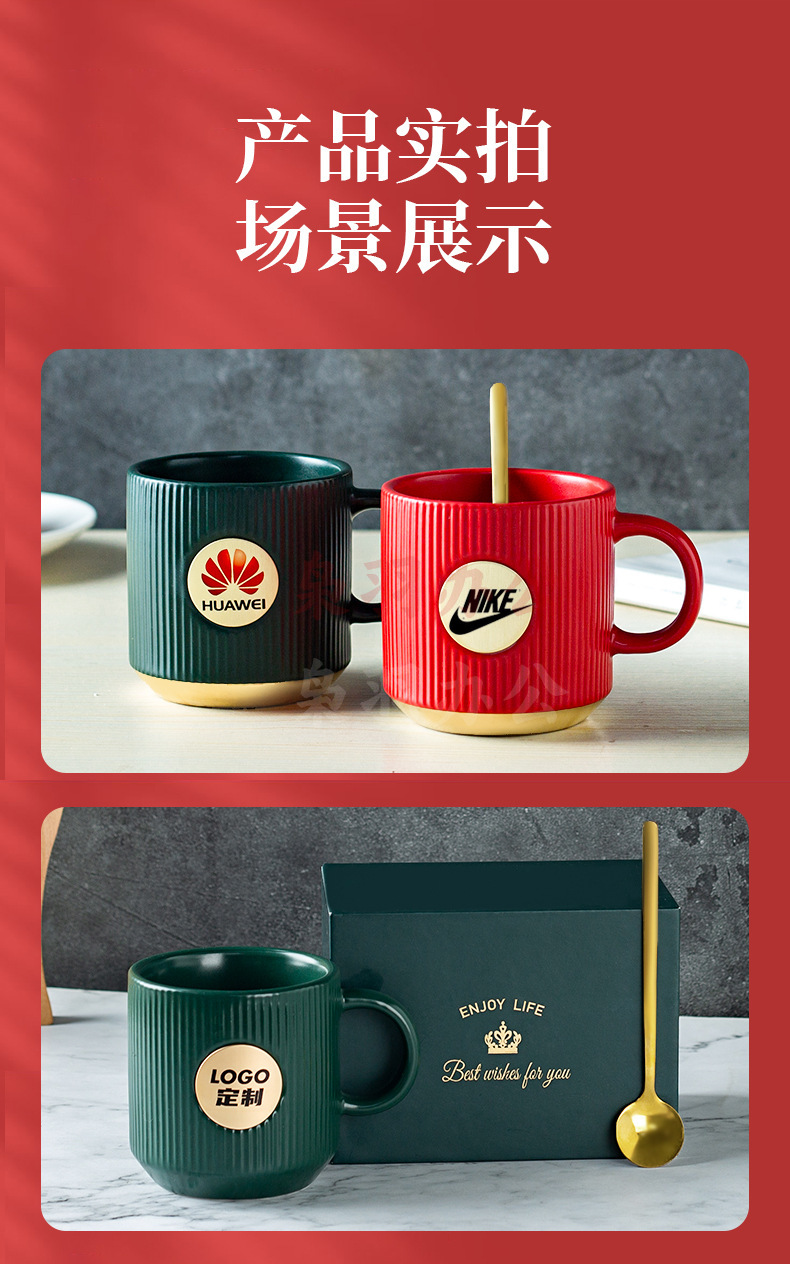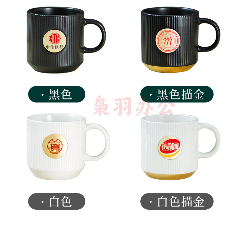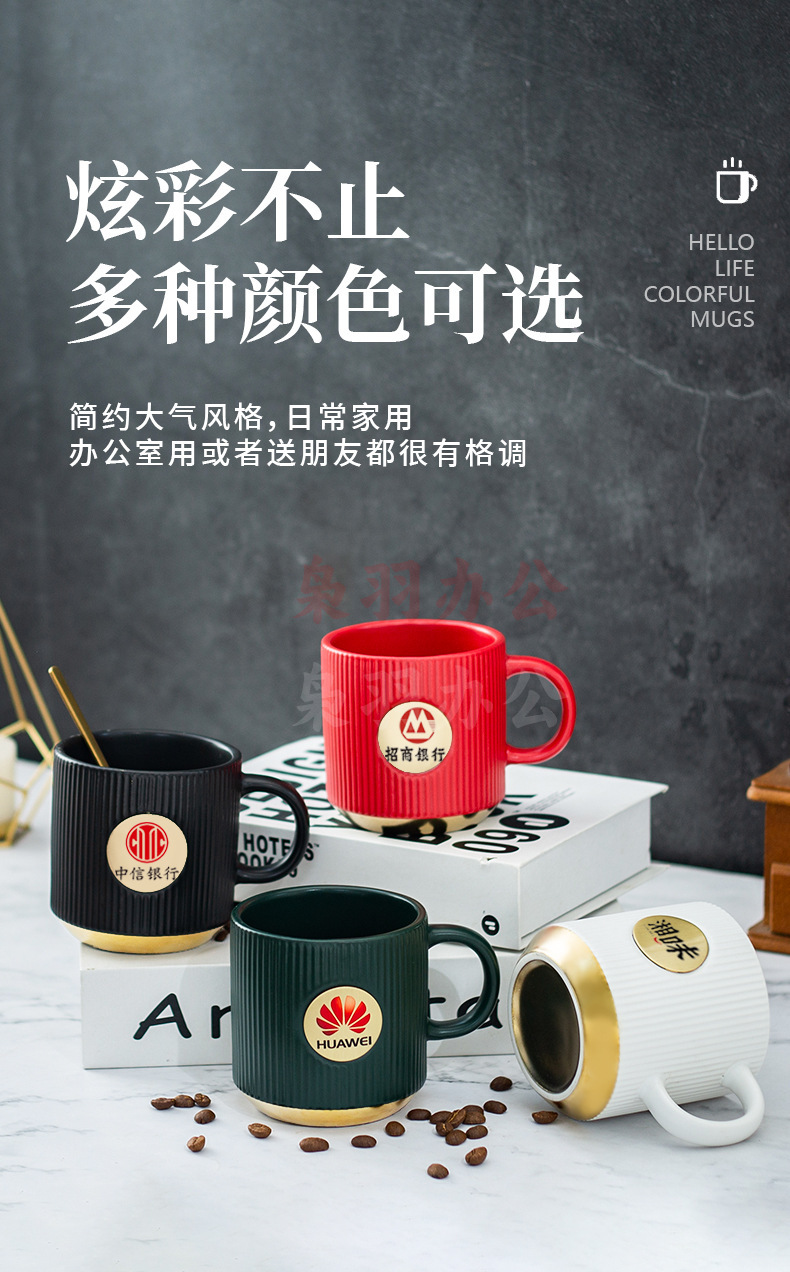 陶瓷马克杯定制LOGO高级条纹铜章来图DIY办公室咖啡情侣礼盒套装(白色竖纹描金铜章杯【精品礼盒】)