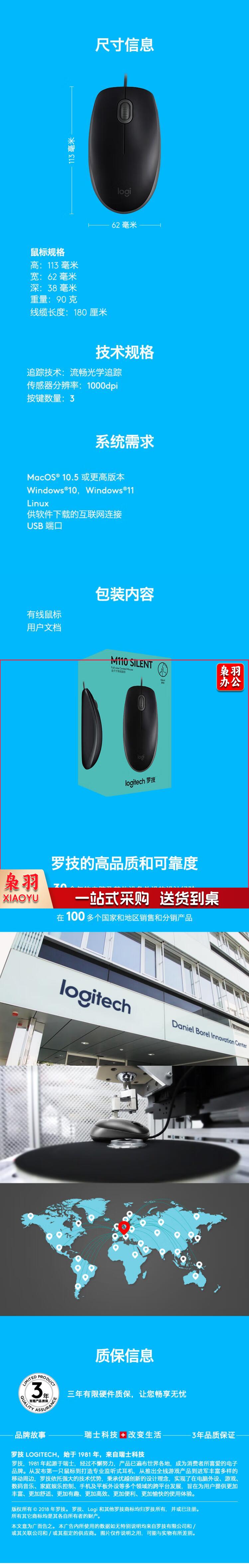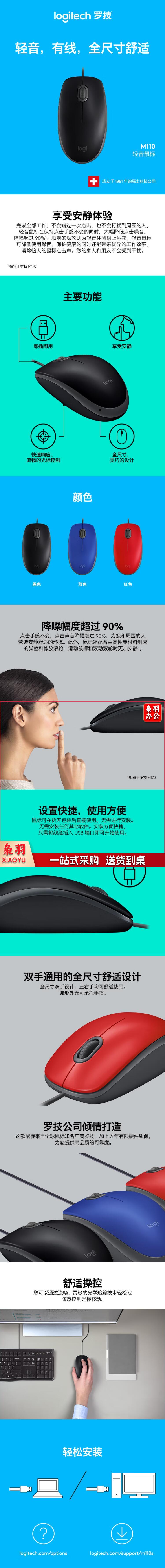 罗技( Logitech) M110 有线静音鼠标 黑色