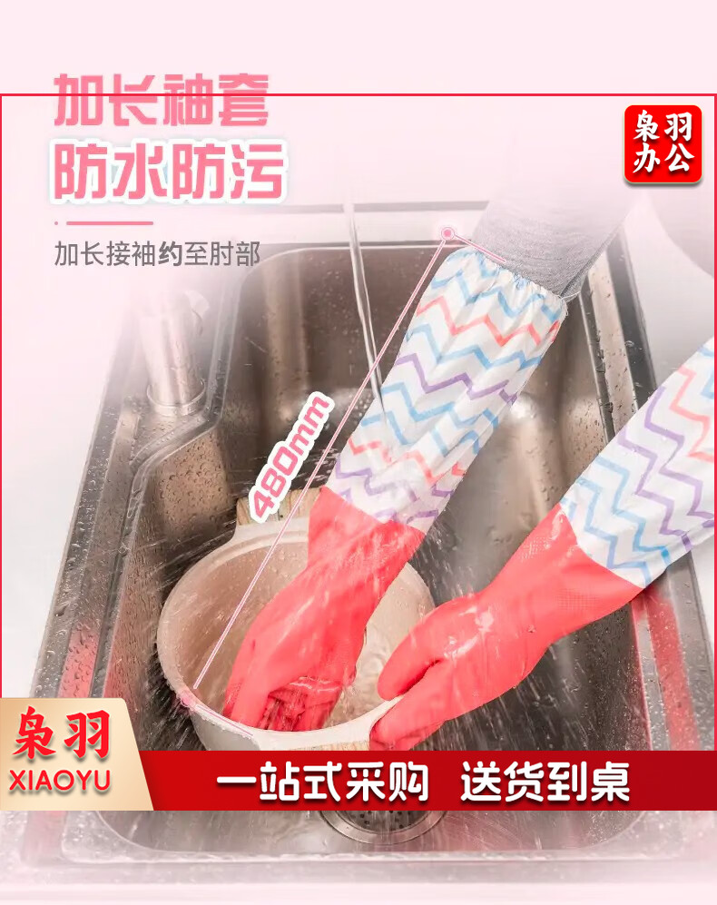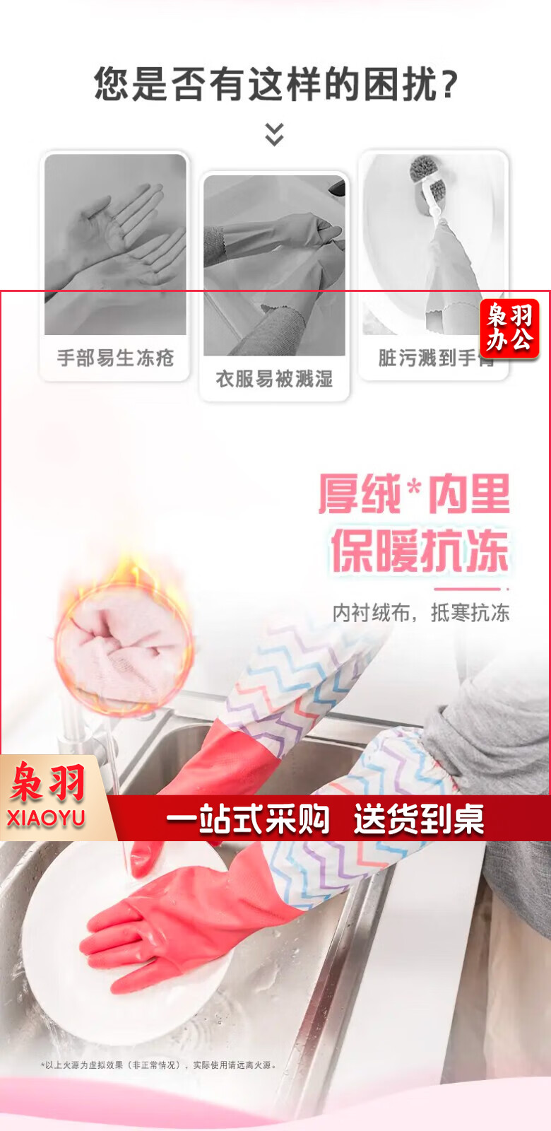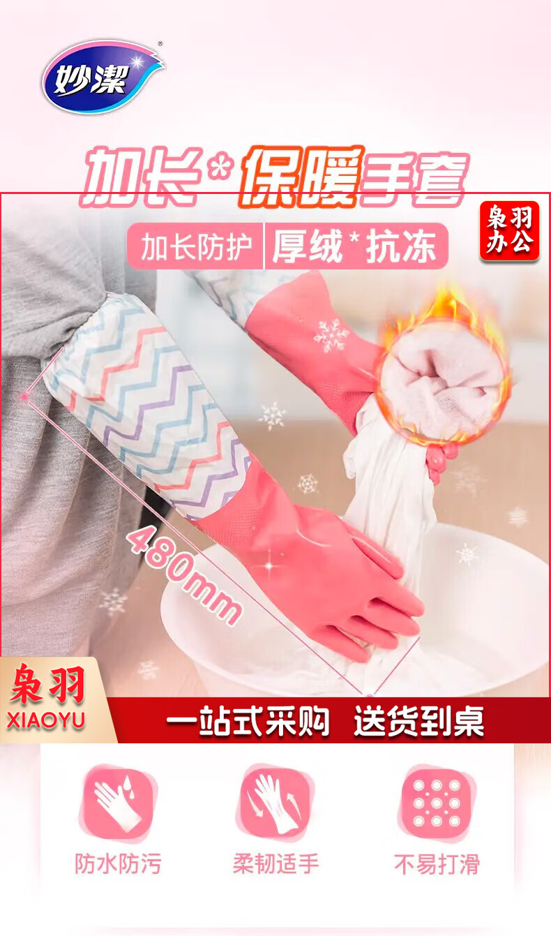 妙洁长款保暖绒里手套加厚绒 家务防水洗衣服橡胶皮手套加绒洗碗手套 均码2双