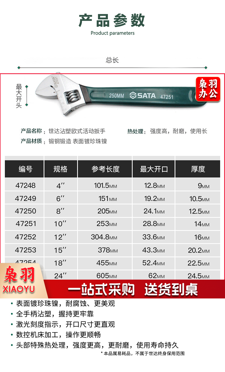 世达(SATA)47251 沾塑欧式活动扳手多规格可选 10"活动扳手