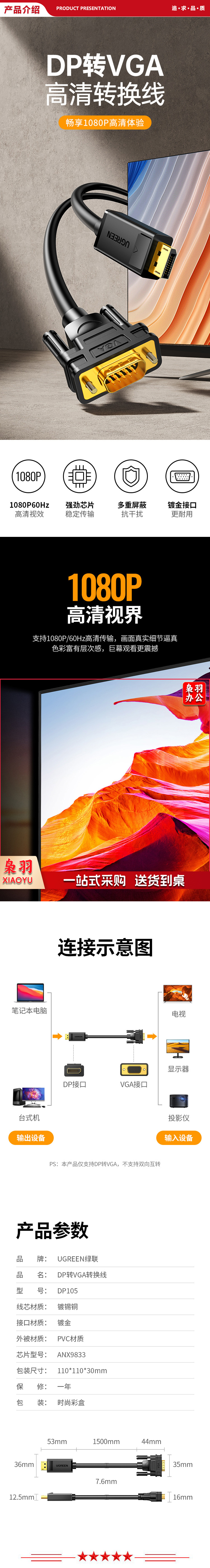 绿联 UGREEN 10247 DP转VGA转换线 DP105 DisplayPort转VGA公对公 高清视频连接线 1.5米