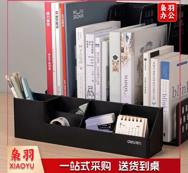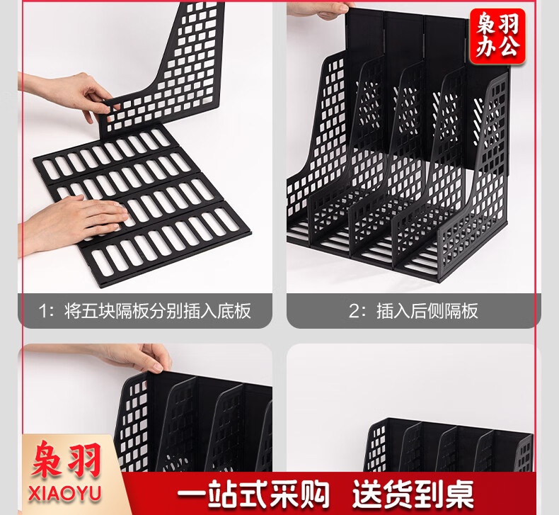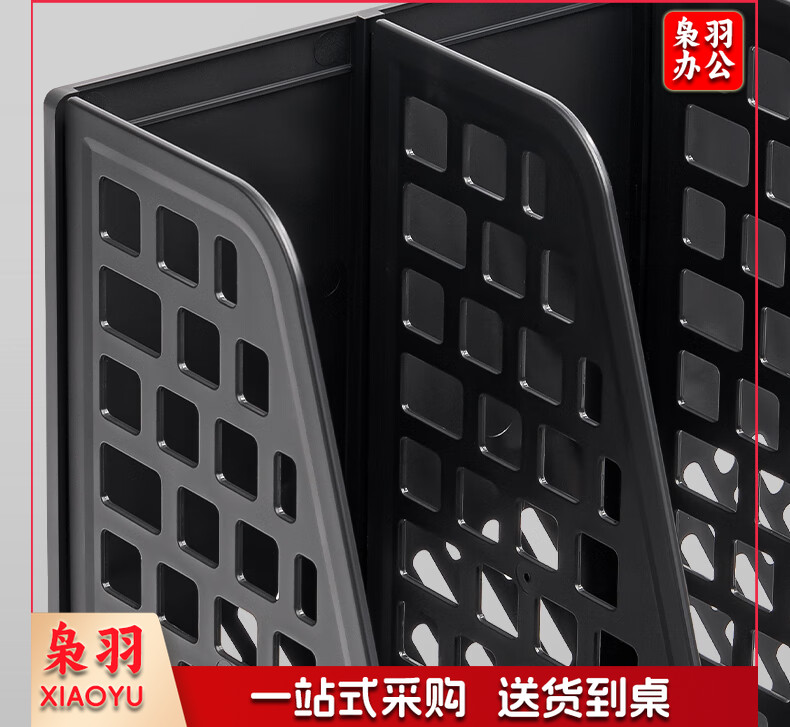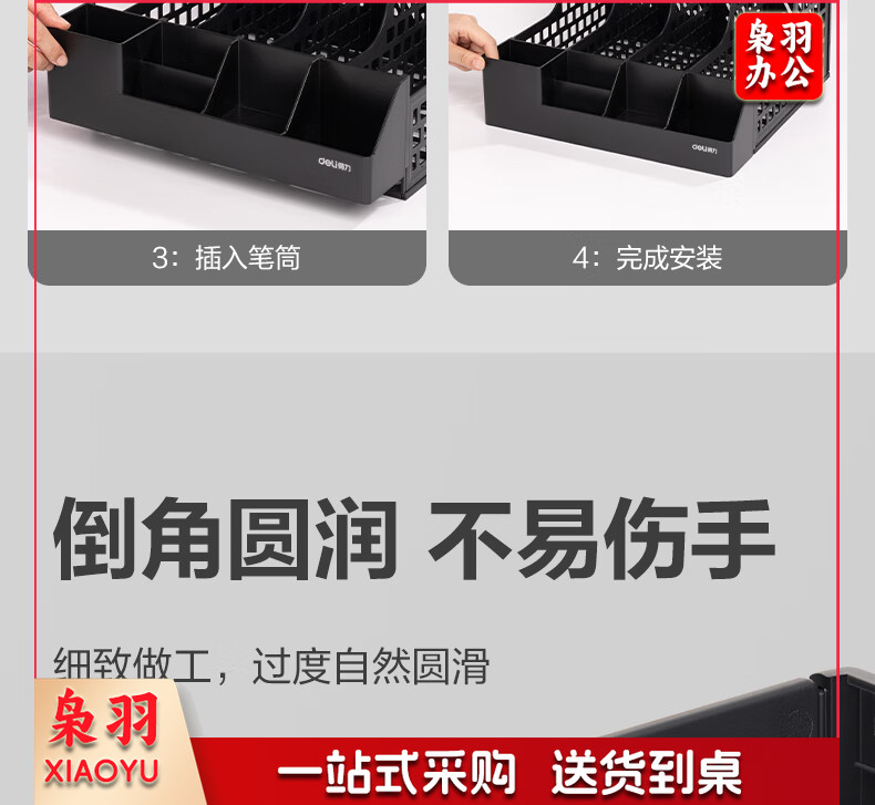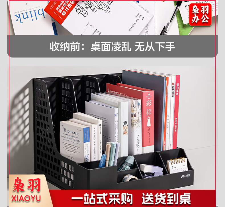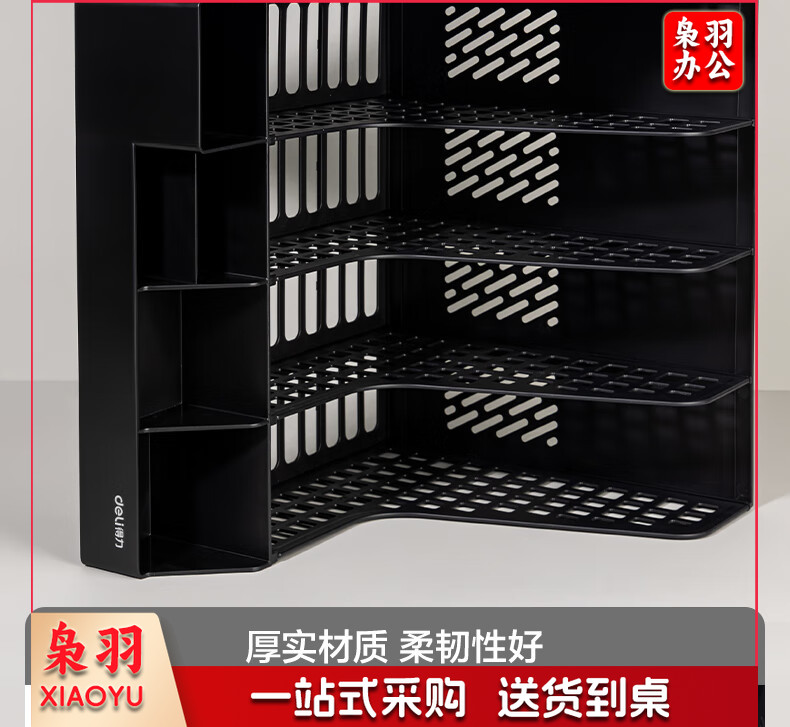得力(deli)4联带笔筒多功能桌面档案收纳盒文件框栏篮盘书立架 办公用品多层文件置物架资料架镂空黑色