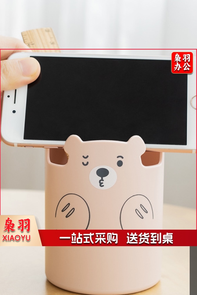 桌面办公学生小熊笔筒可爱简约桌面文具化妆刷收纳手机支架笔筒 粉色