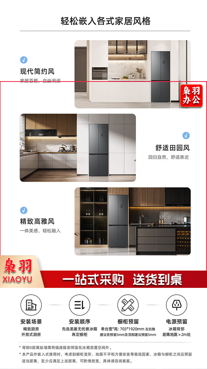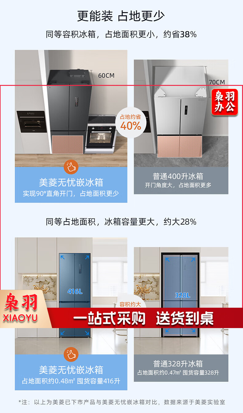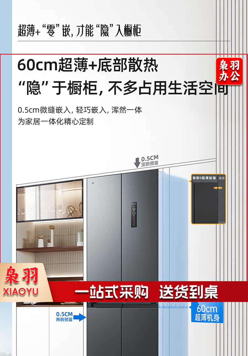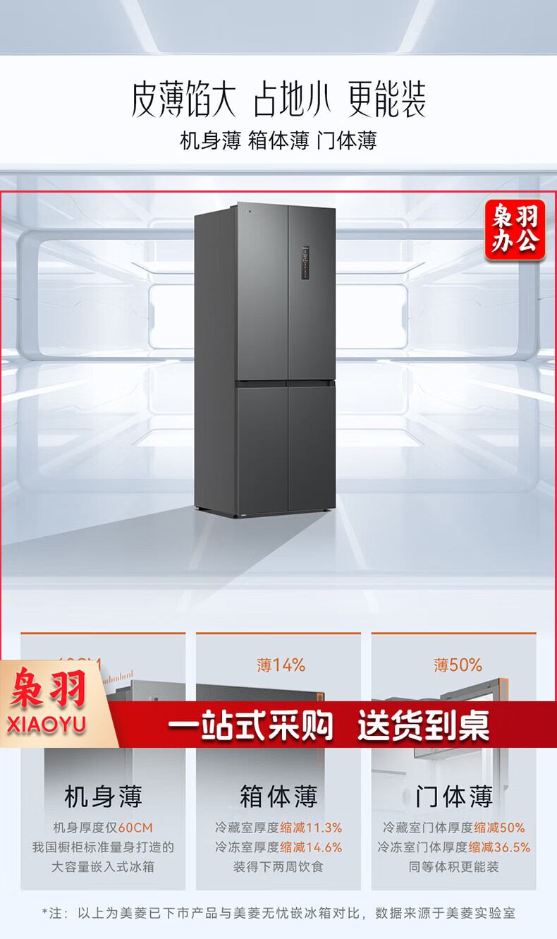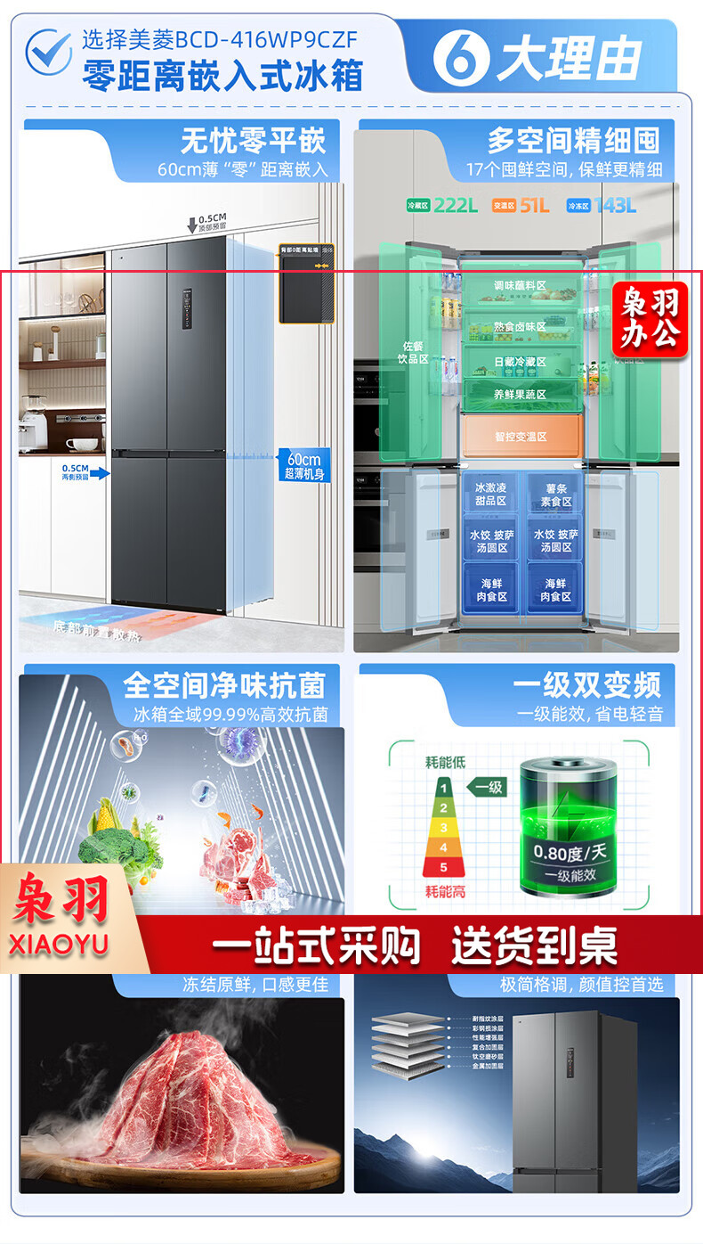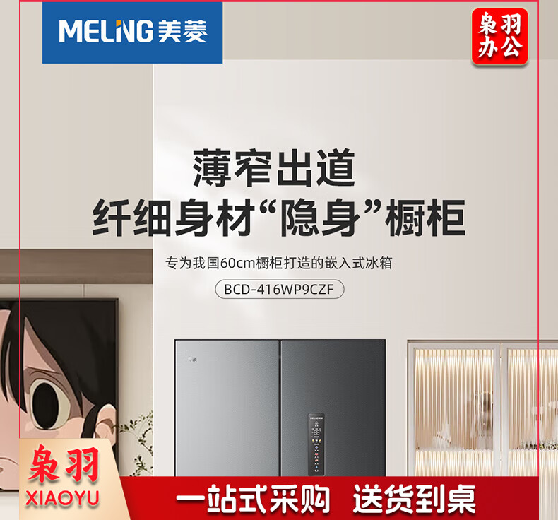 美菱(MeiLing)416升四开对开十字门超薄零平嵌入冰箱一级能效无霜家用大容量BCD-416WP9CZF