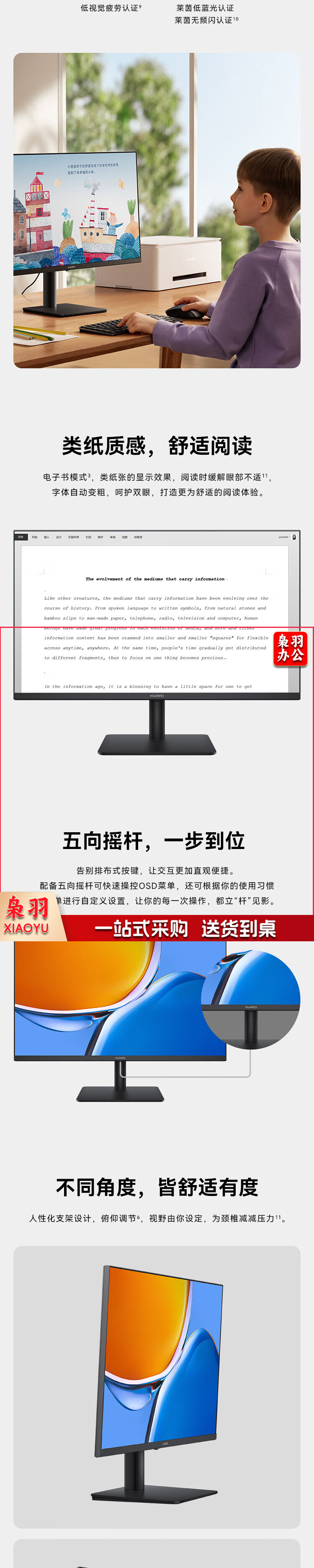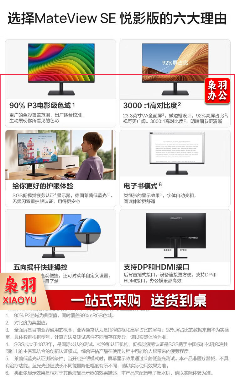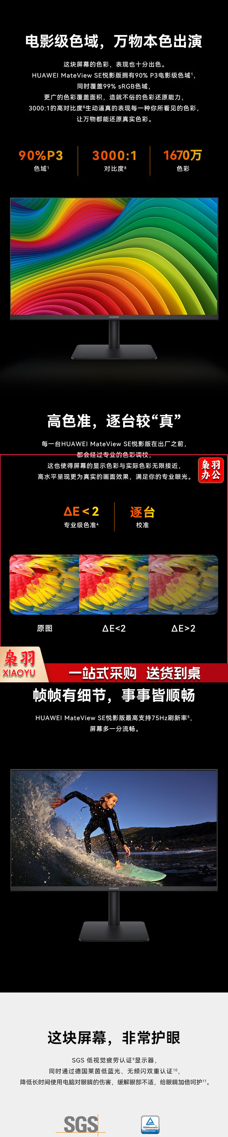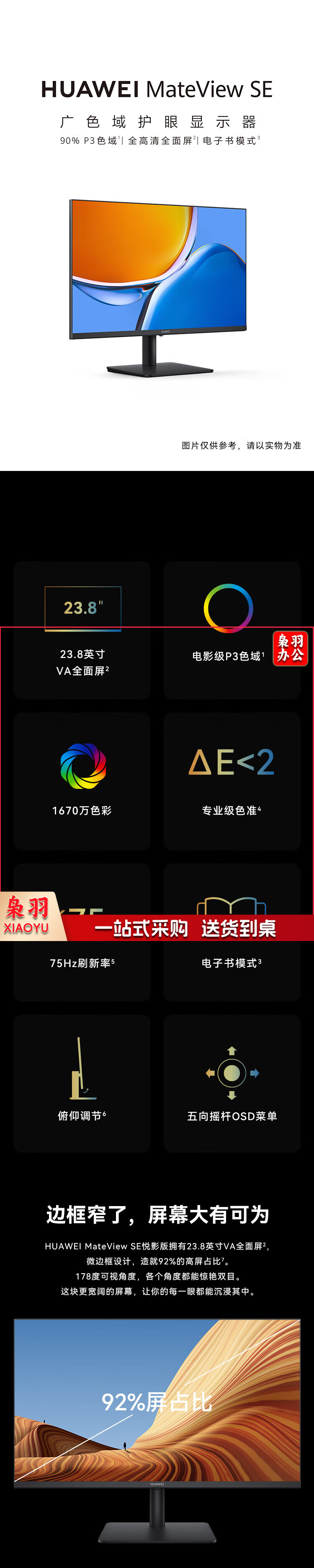 华为MateViewSE悦影版显示器23.8英寸VA全面屏90%P3广色域低蓝光无频闪电子书模式电脑办公(单位:台)