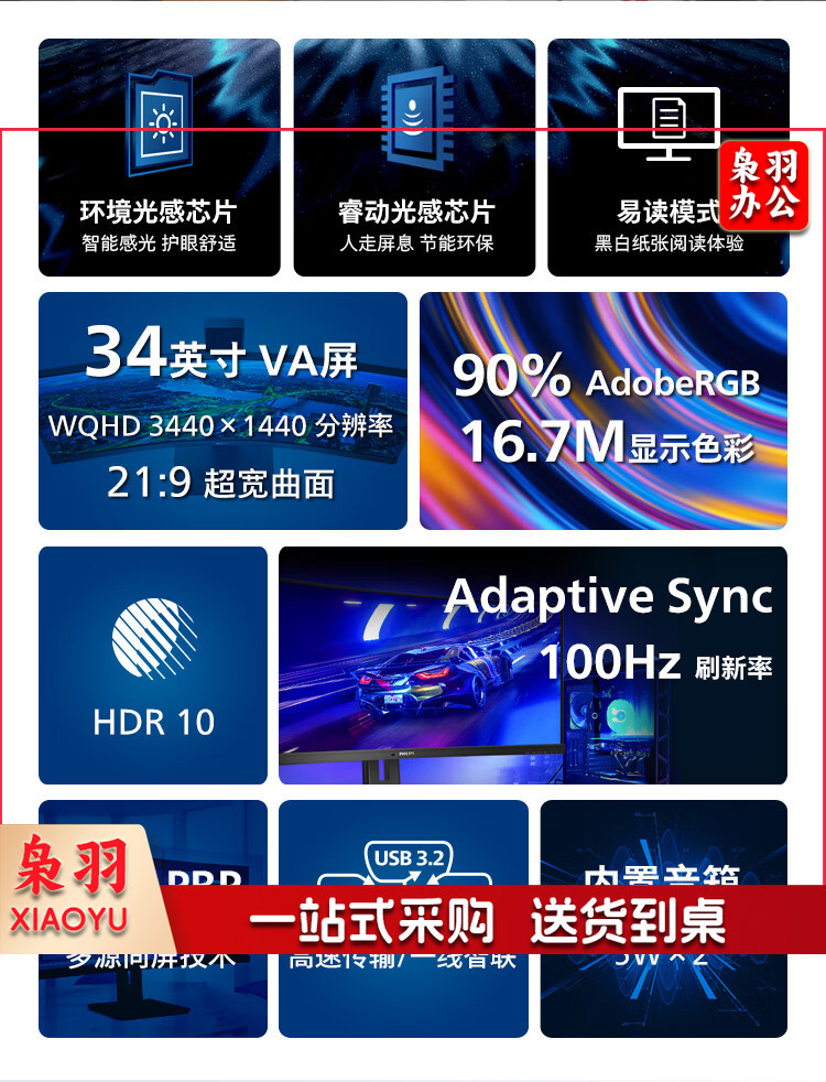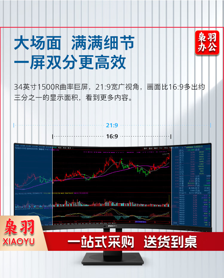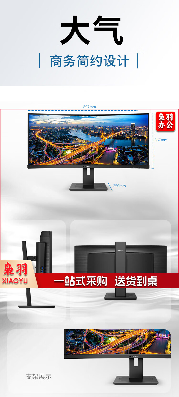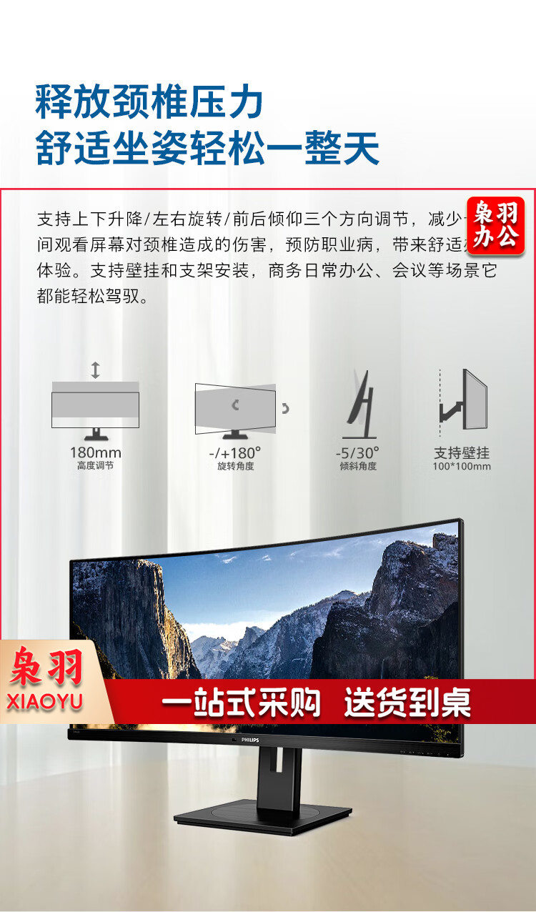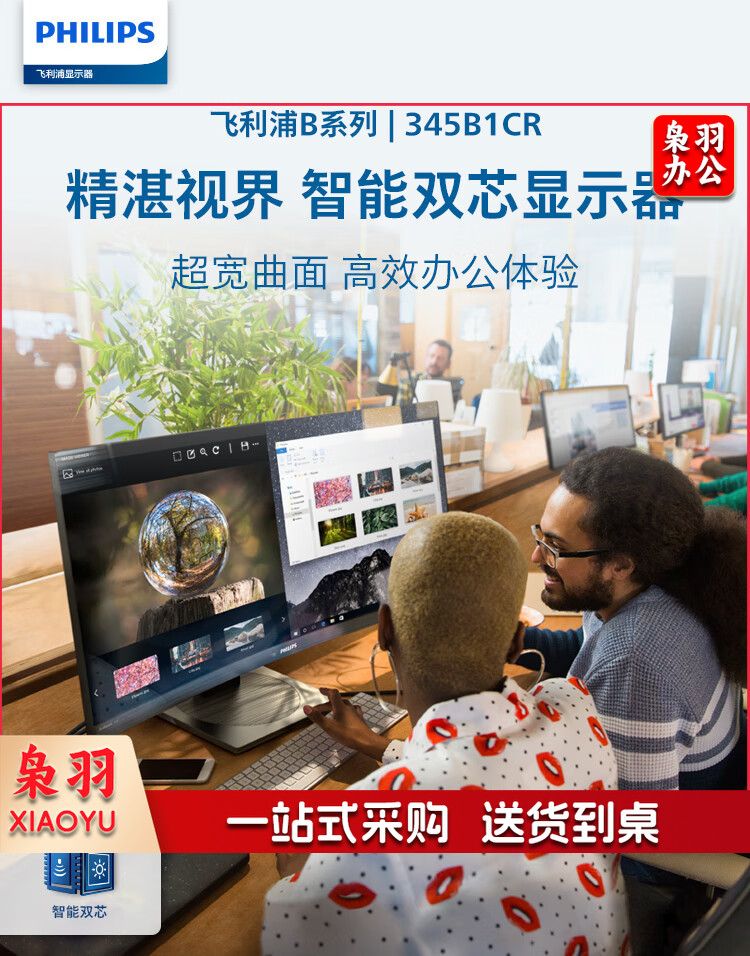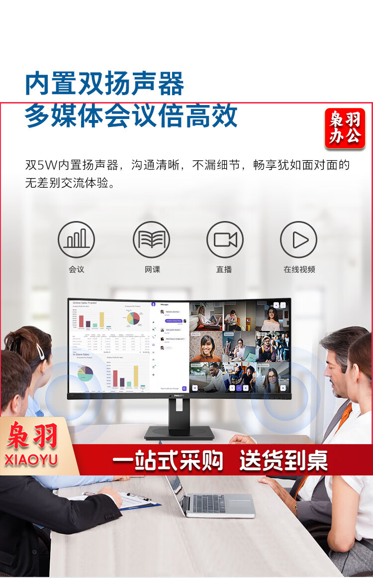 飞利浦(PHILIPS)34英寸曲面显示器 21:9带鱼屏准4k多视窗分屏智能双芯电脑显示屏 345B1CR 企业业务
