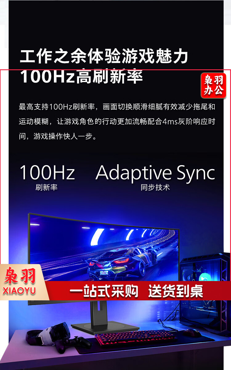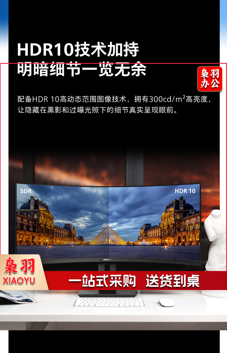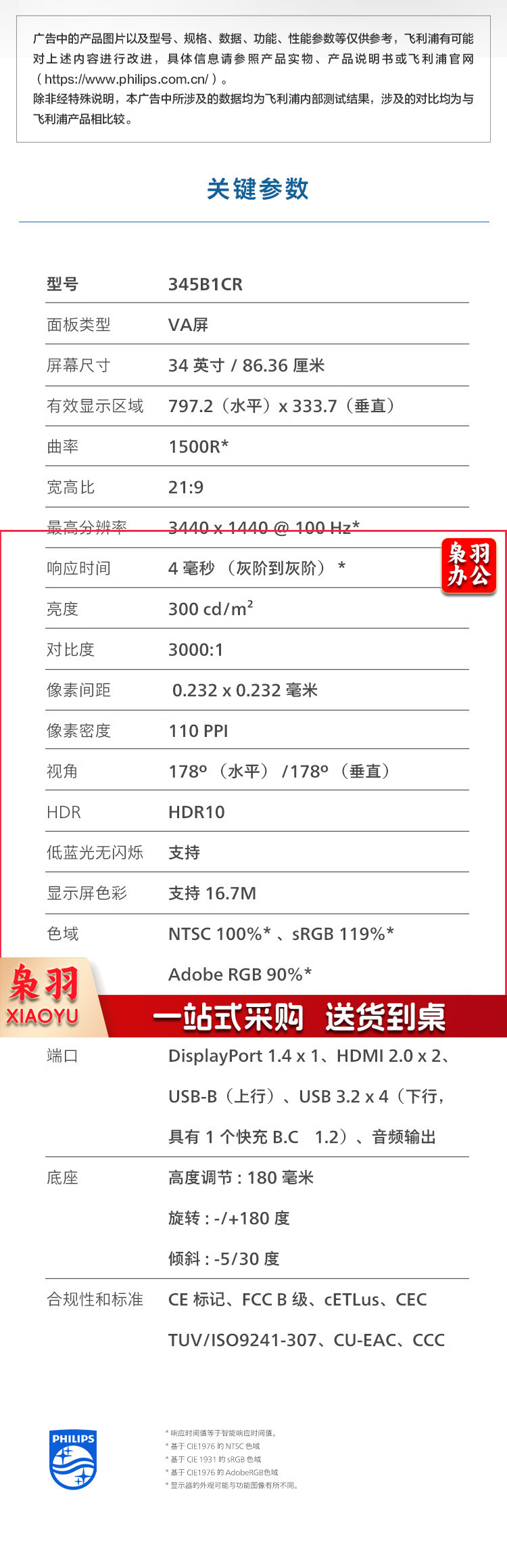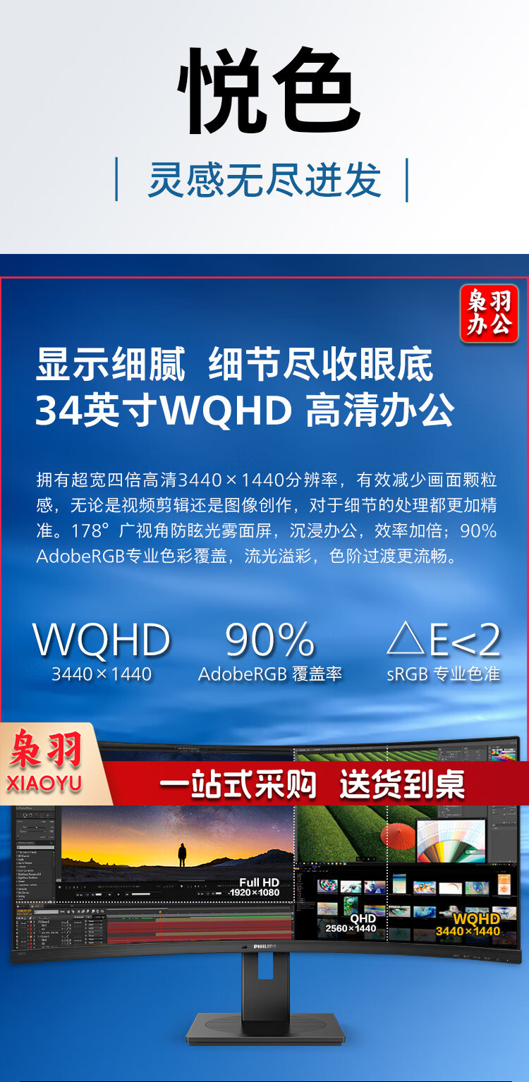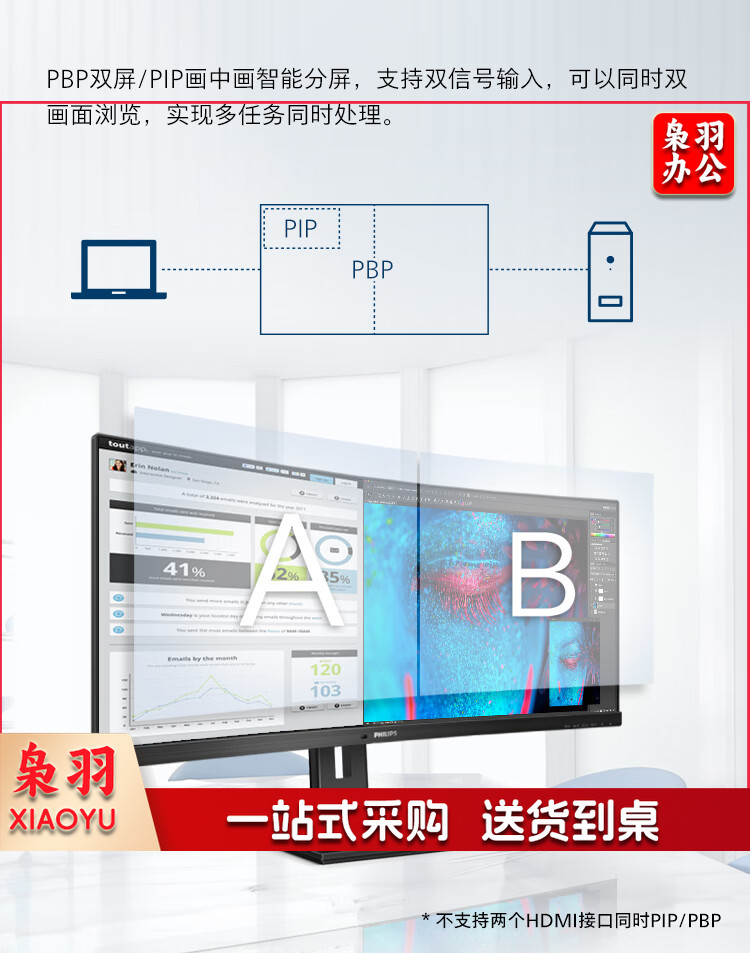 飞利浦(PHILIPS)34英寸曲面显示器 21:9带鱼屏准4k多视窗分屏智能双芯电脑显示屏 345B1CR 企业业务