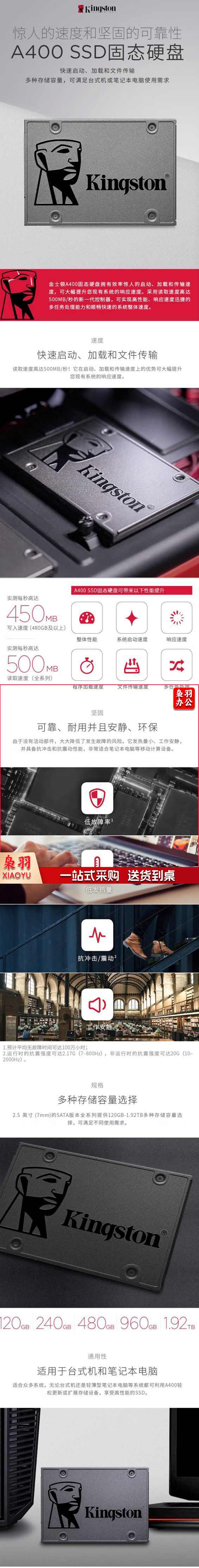 金士顿(Kingston) A400 SSD固态硬盘 SATA3.0接口 240G(HZH)