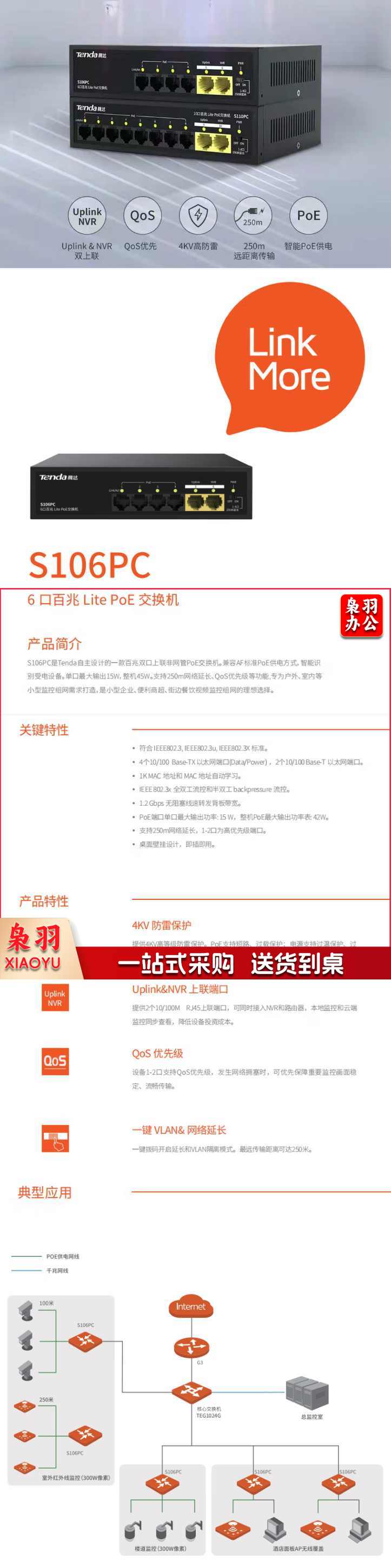 Tenda 腾达6口8口国标POE监控交换机 S110PC 70W百兆