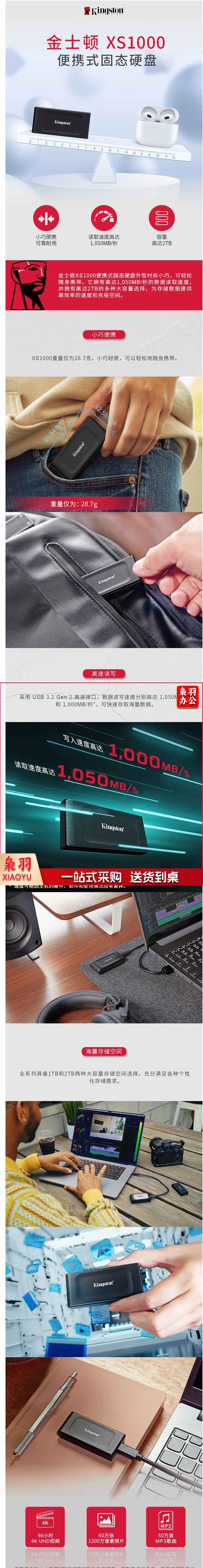 金士顿(Kingston)1TB USB3.2 Gen 2 移动固态硬盘(PSSD)XS1000 传输速度1050MB/s