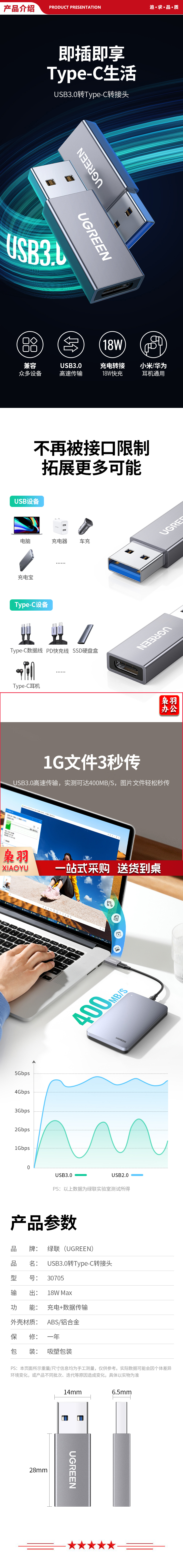 绿联 UGREEN 30705 USB3.0转Type-C转换器 USB-C数据线转接头