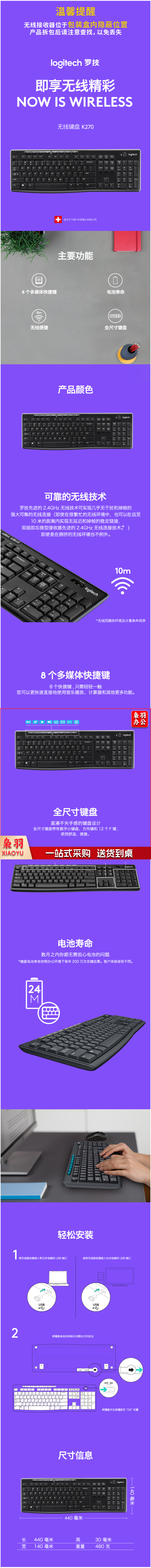 罗技(Logitech)K270 无线键盘多媒体全尺寸便捷舒适键盘 单位:个
