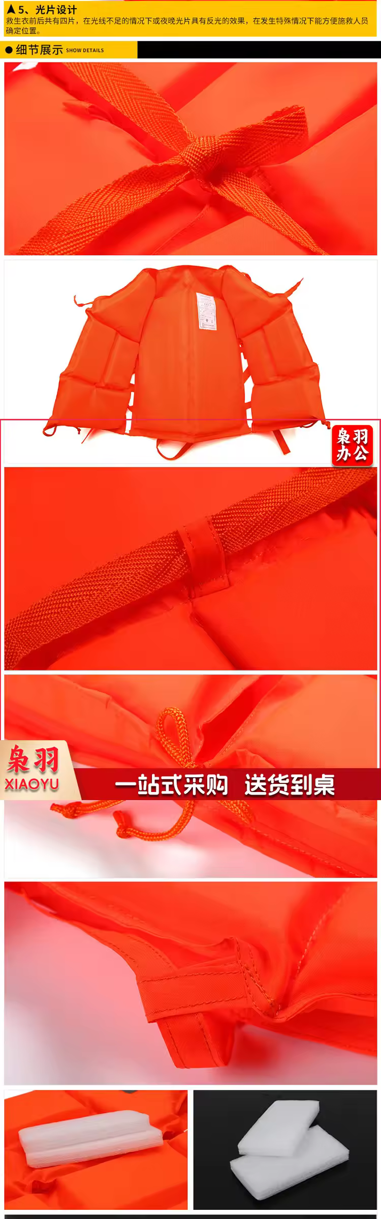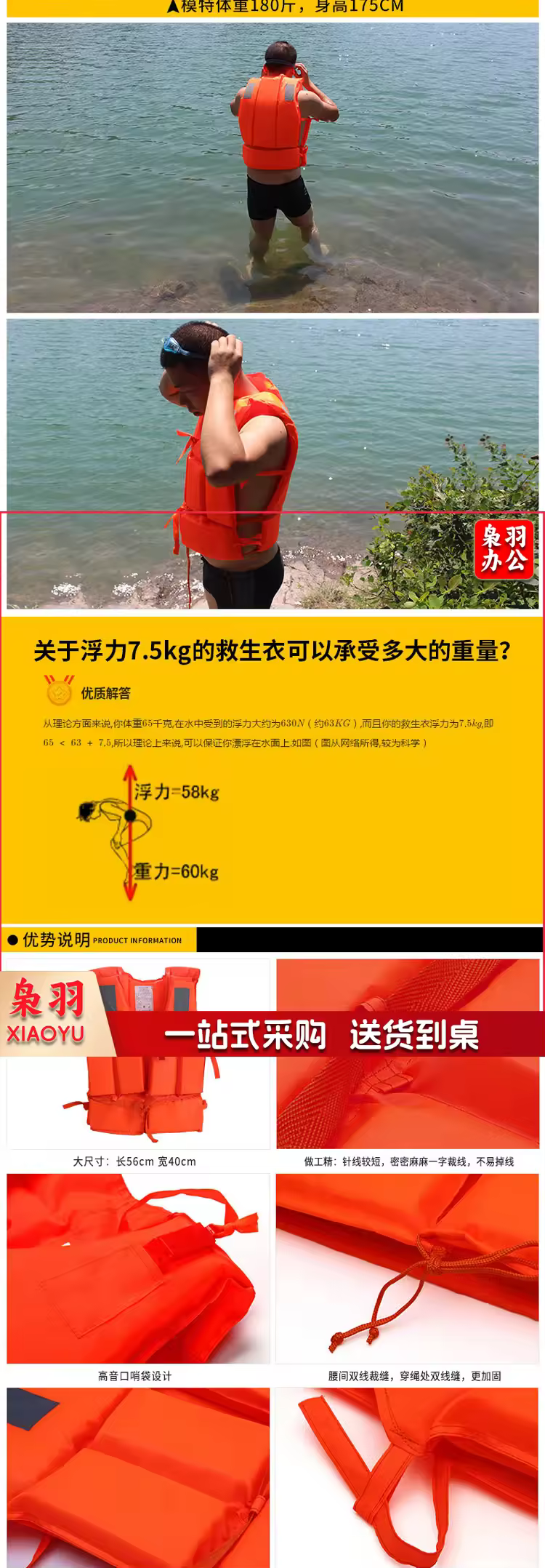 成人救生衣浮力背心户外钓鱼马甲游泳漂流带口哨反光条加厚绑带_橙色_均码