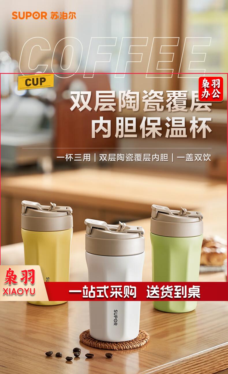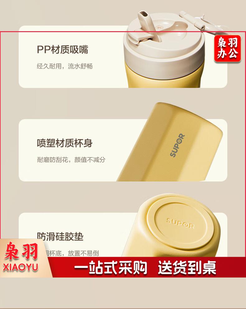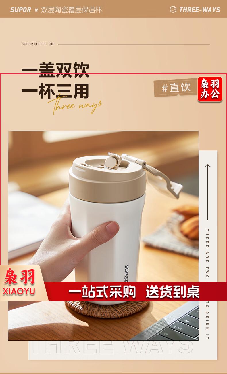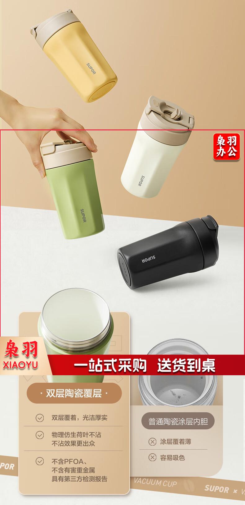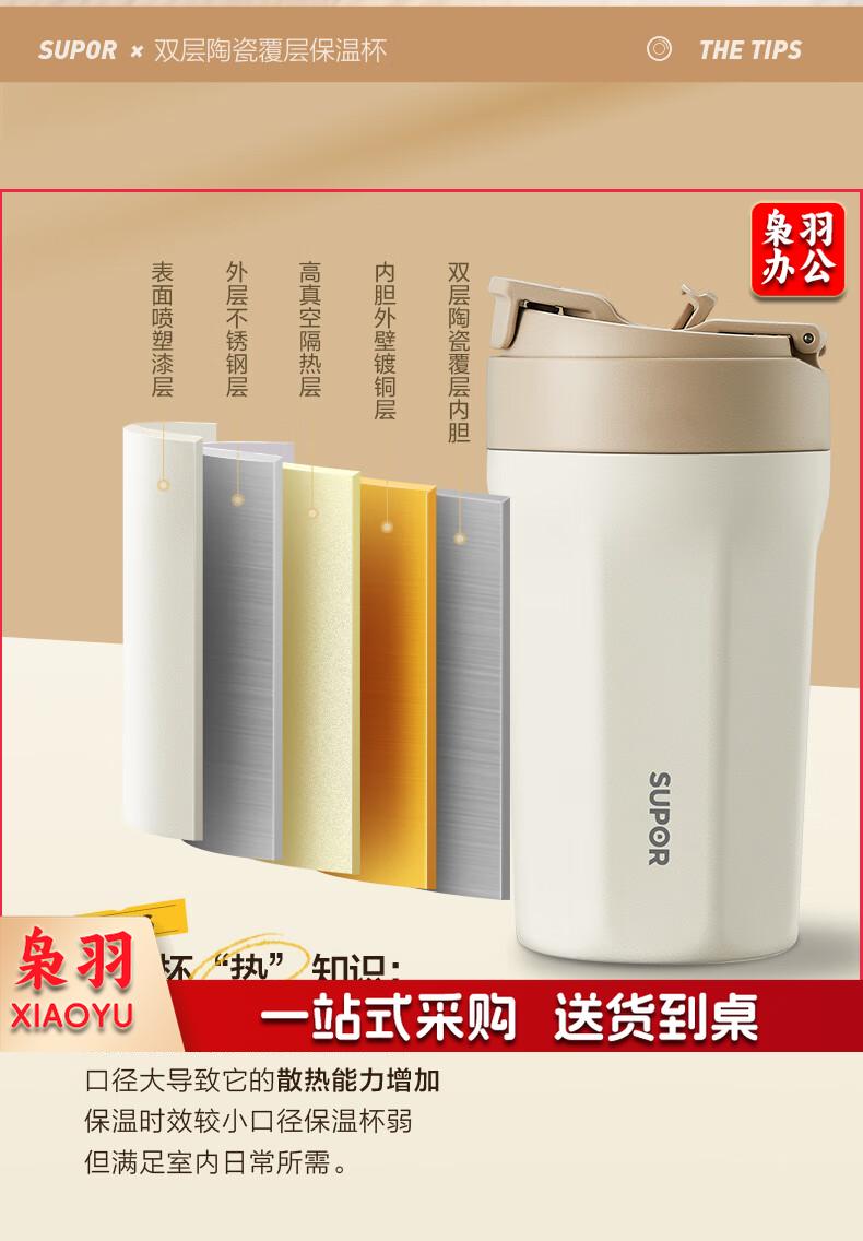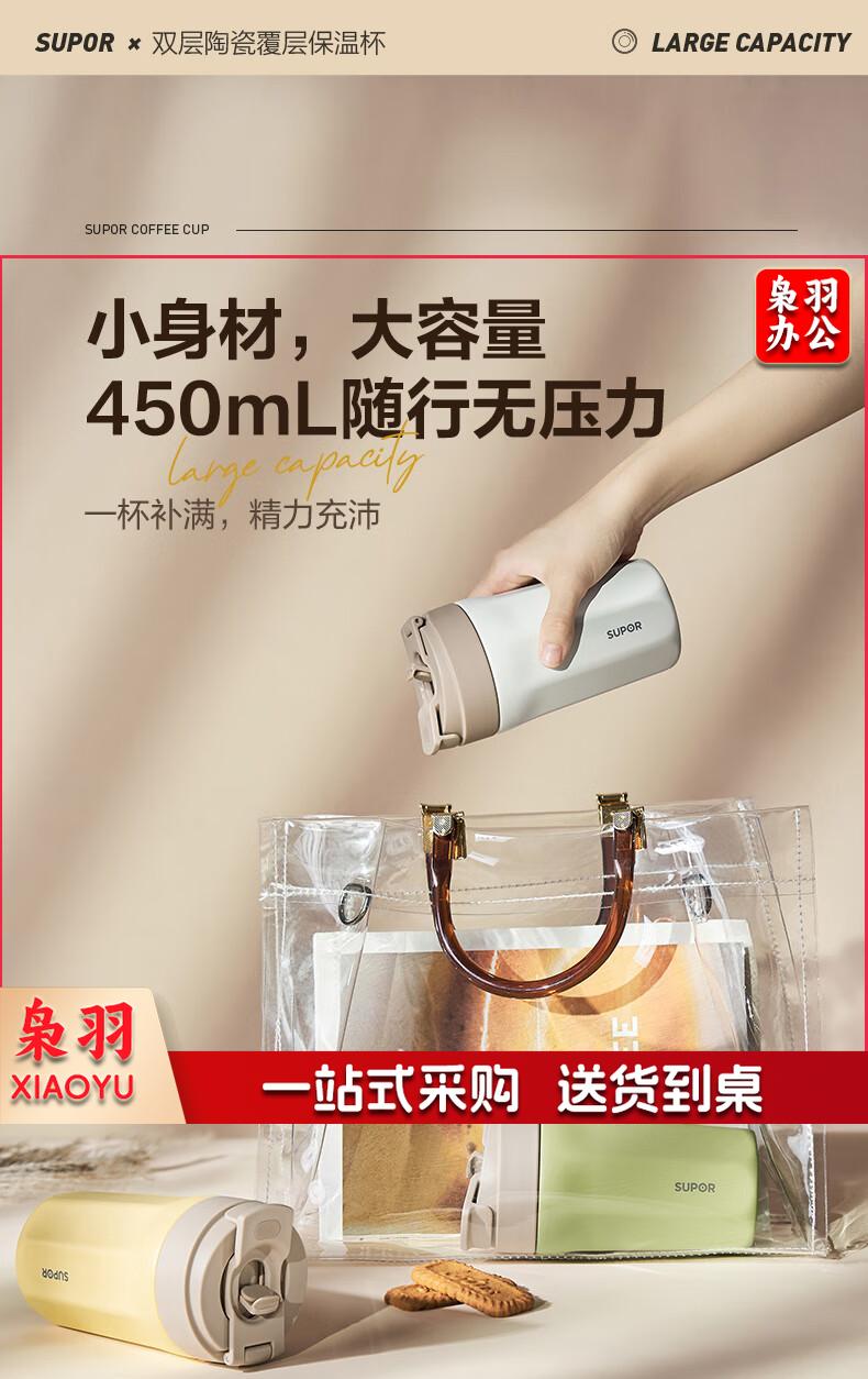苏泊尔(SUPOR) 双层陶瓷覆层内胆吸管保温便携水杯子450mL 奶油白 KC45KM10烹调电器
