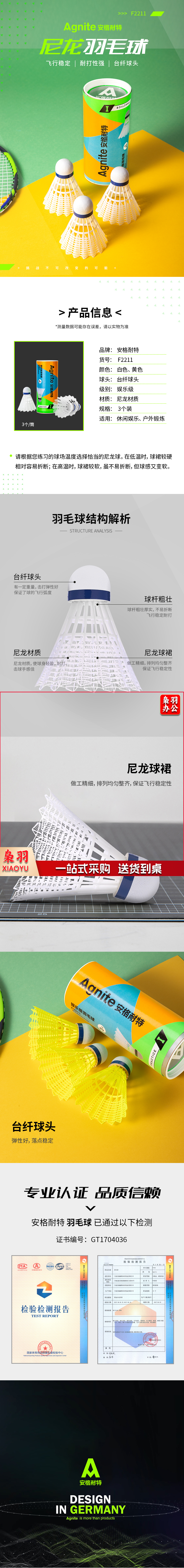 安格耐特(Agnite)F2211尼龙羽毛球(白色)(3个/筒)