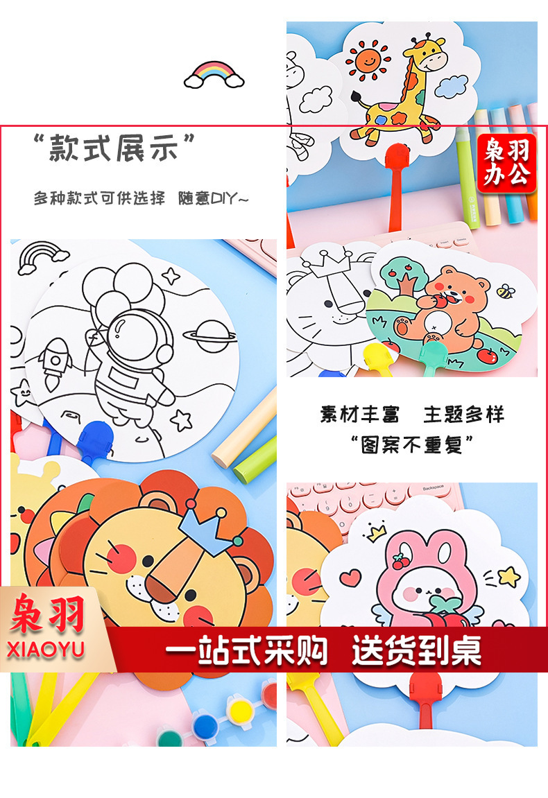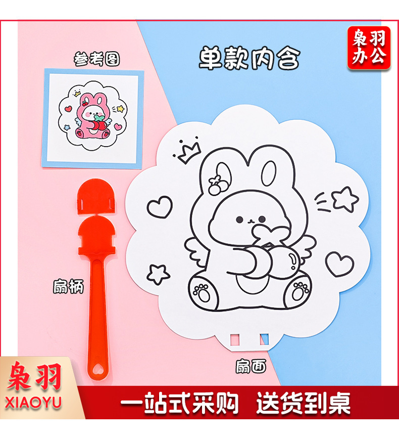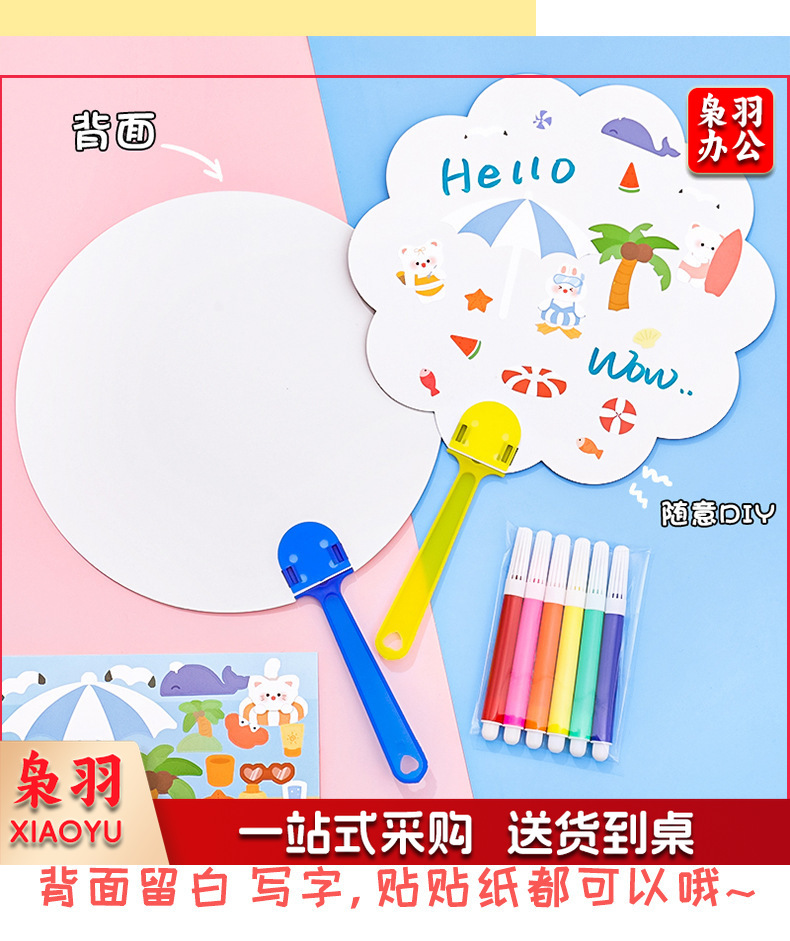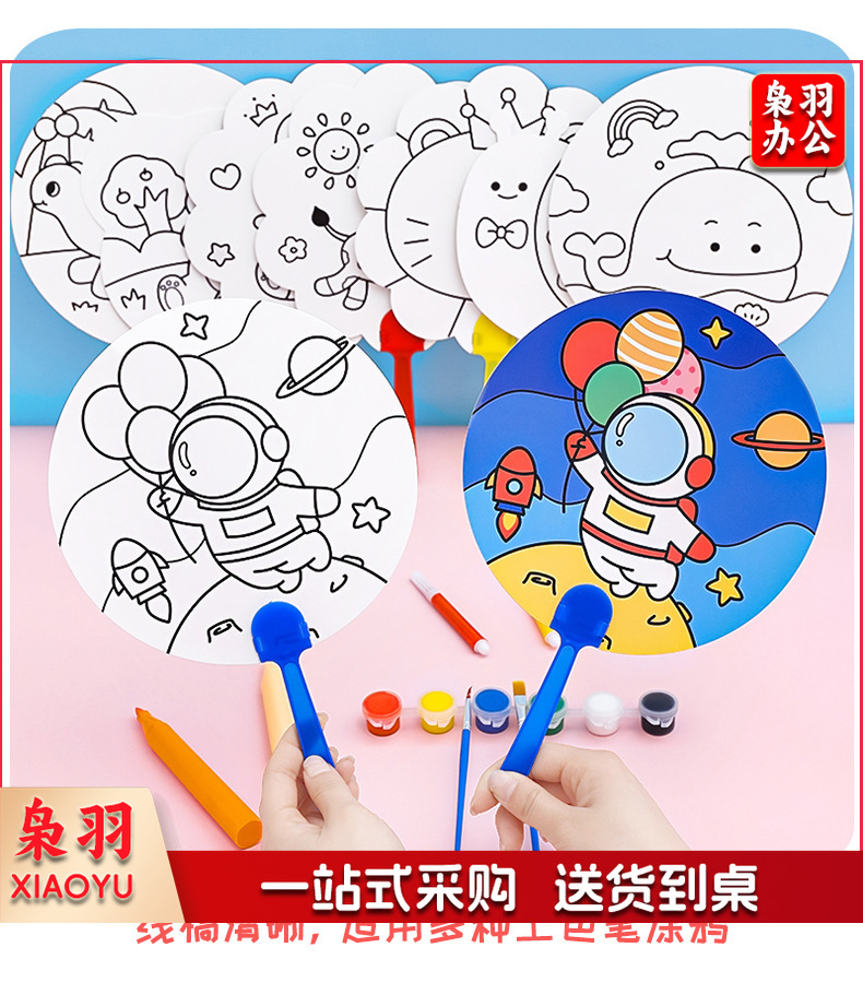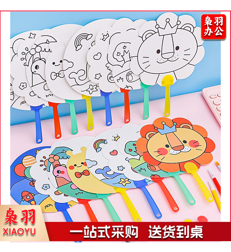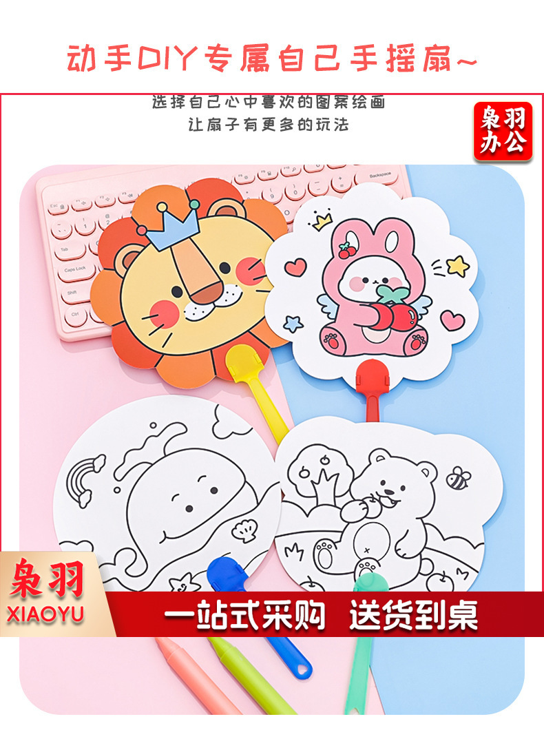 卡通DIY涂鸦扇子小学生手绘填色空白小圆扇幼儿园儿童益智小扇子
