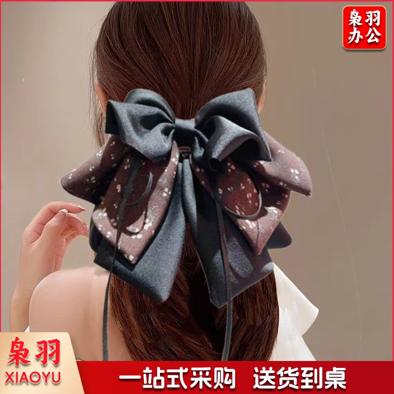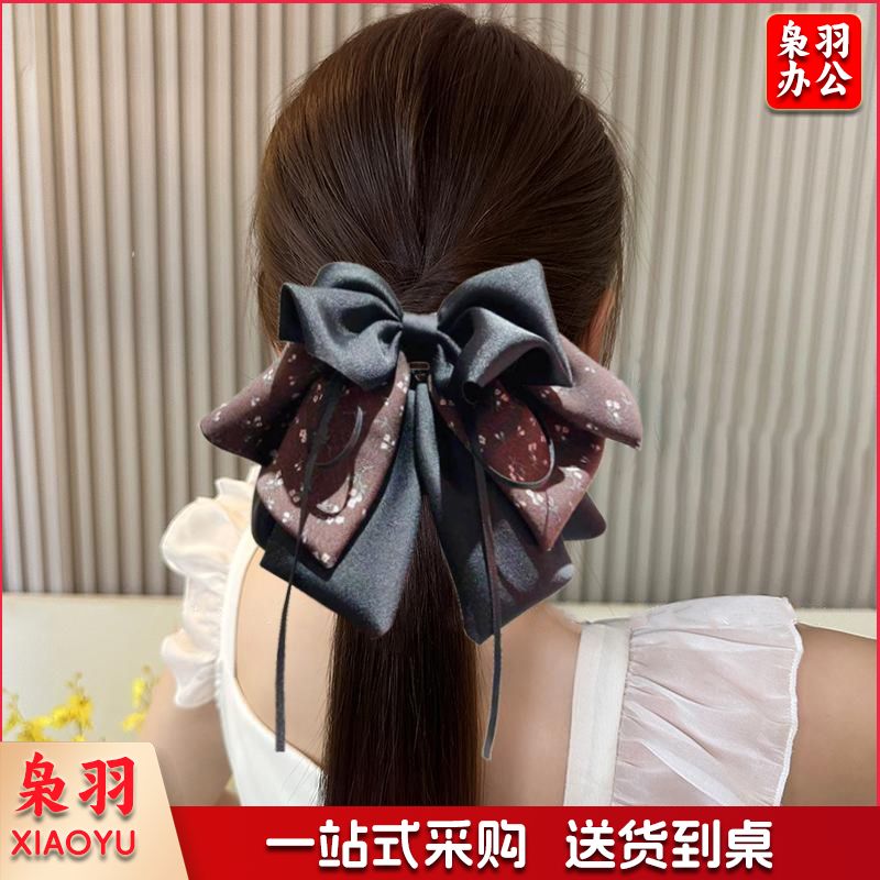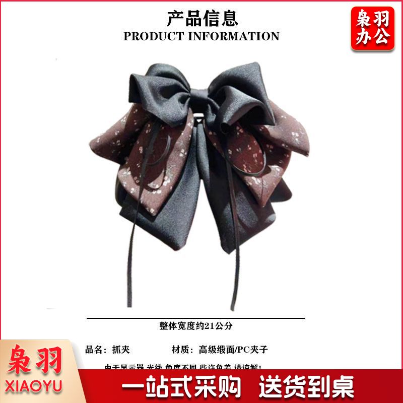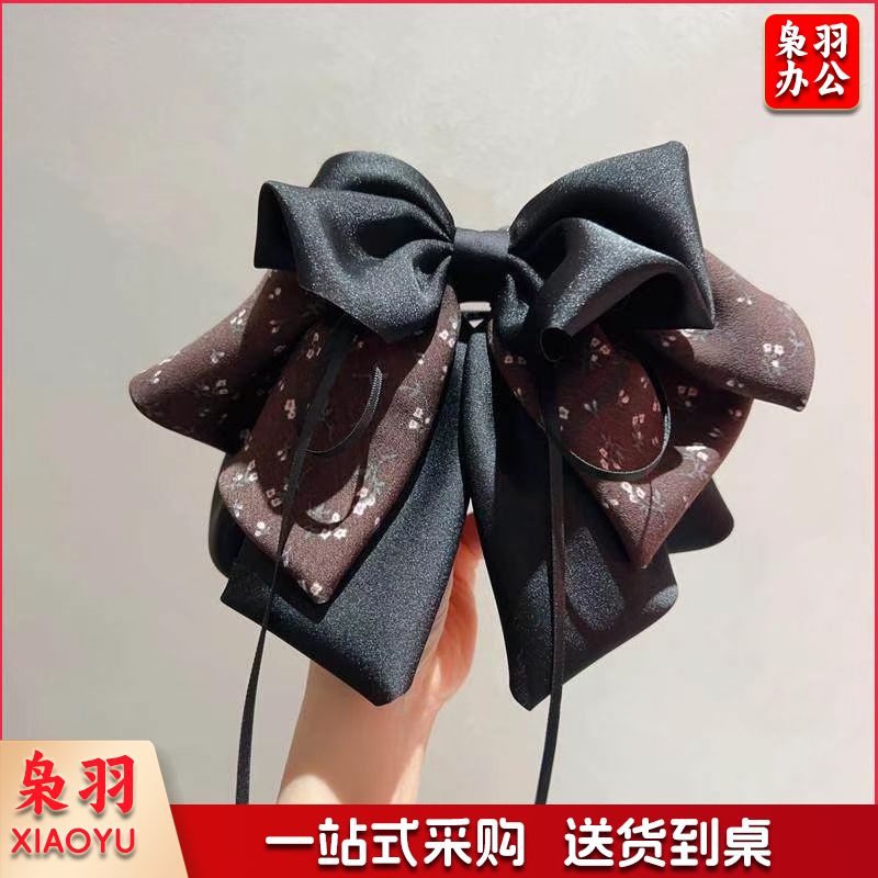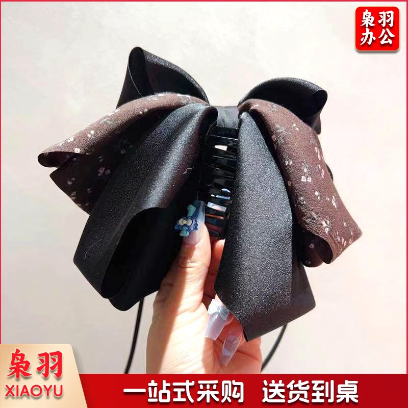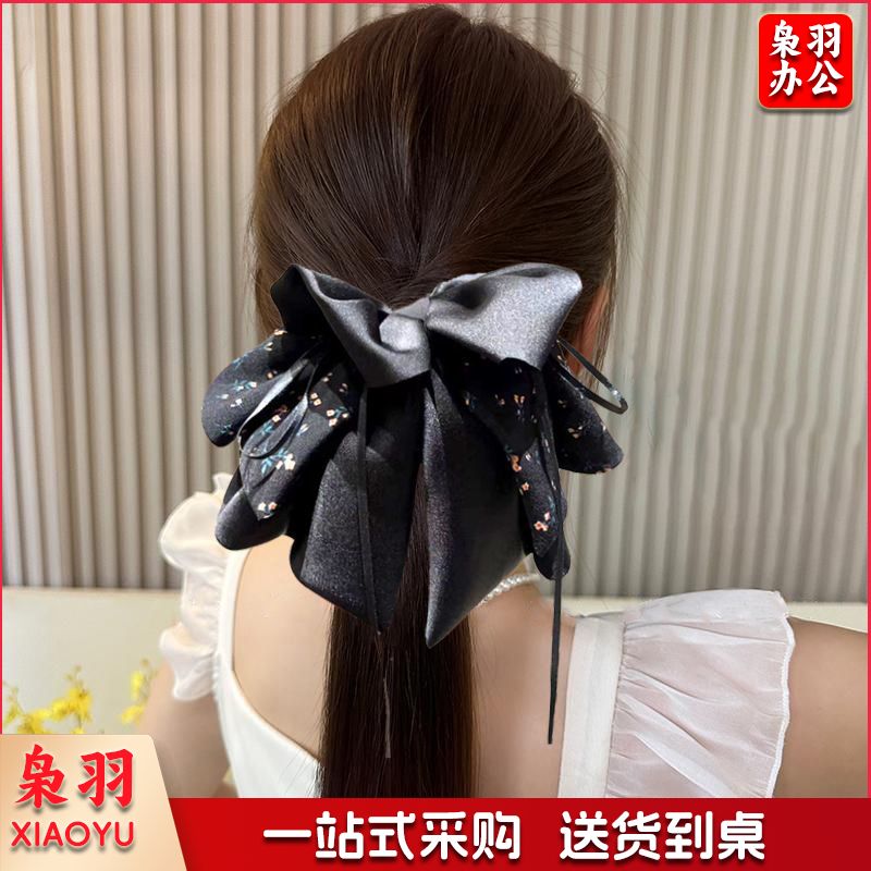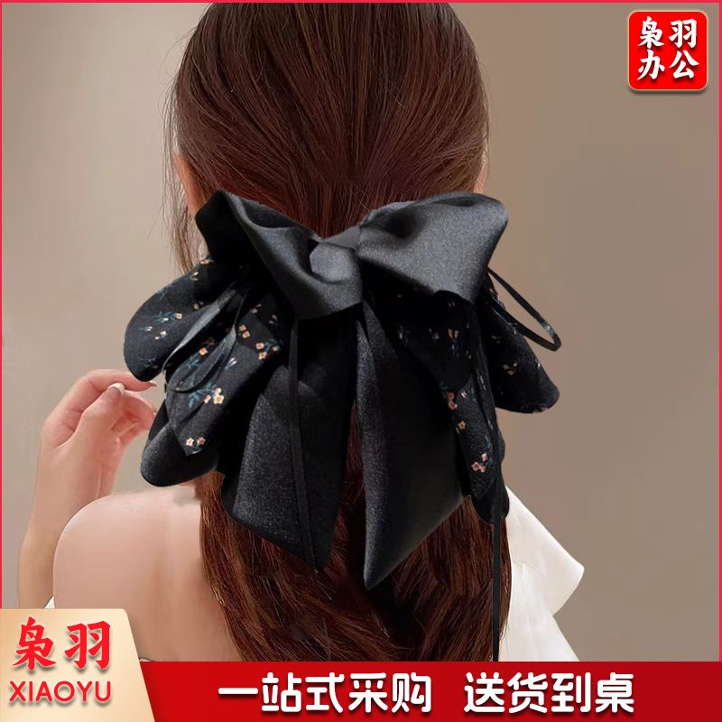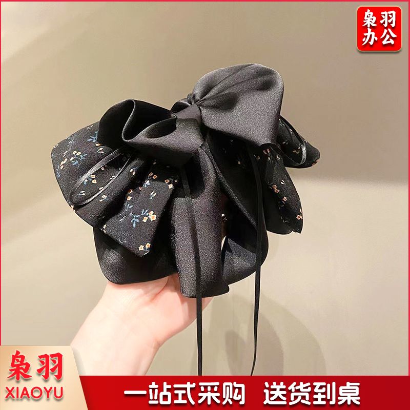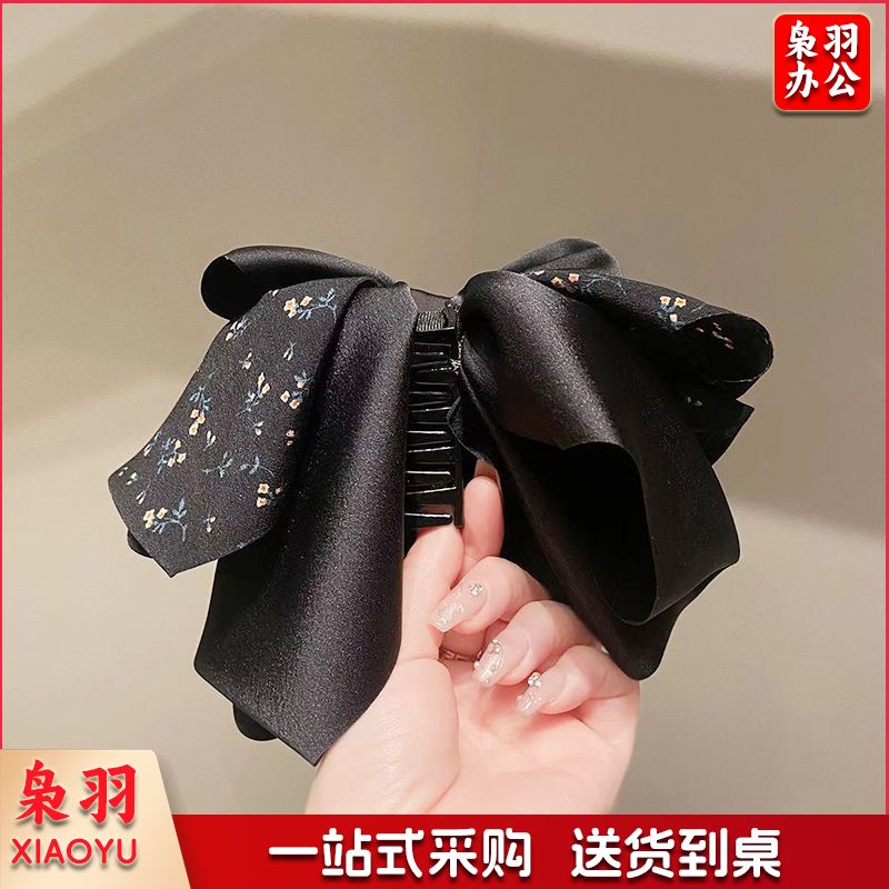 新款高级感清新碎花蝴蝶结抓夹气质飘带马尾夹后脑勺缎面发饰发夹(黑色清新碎花缎面抓夹)