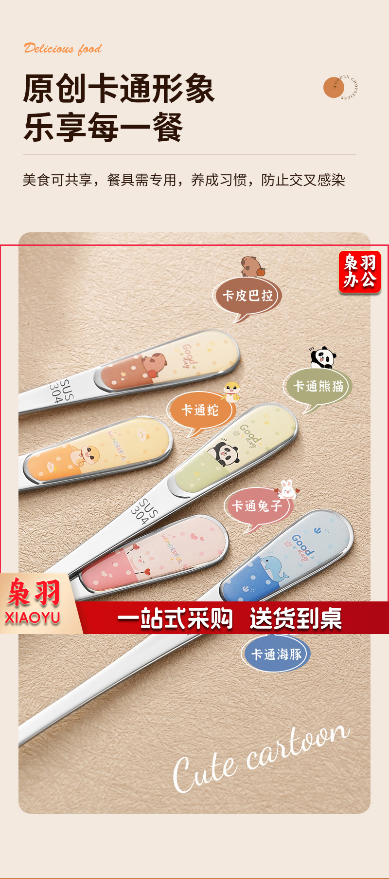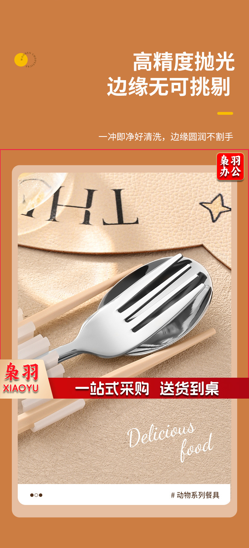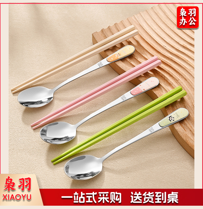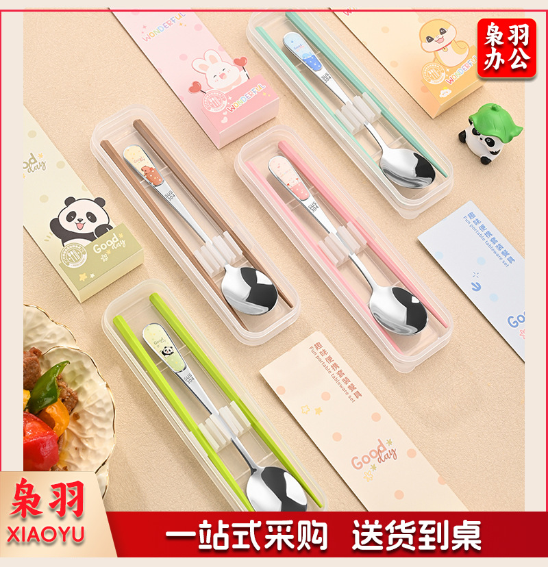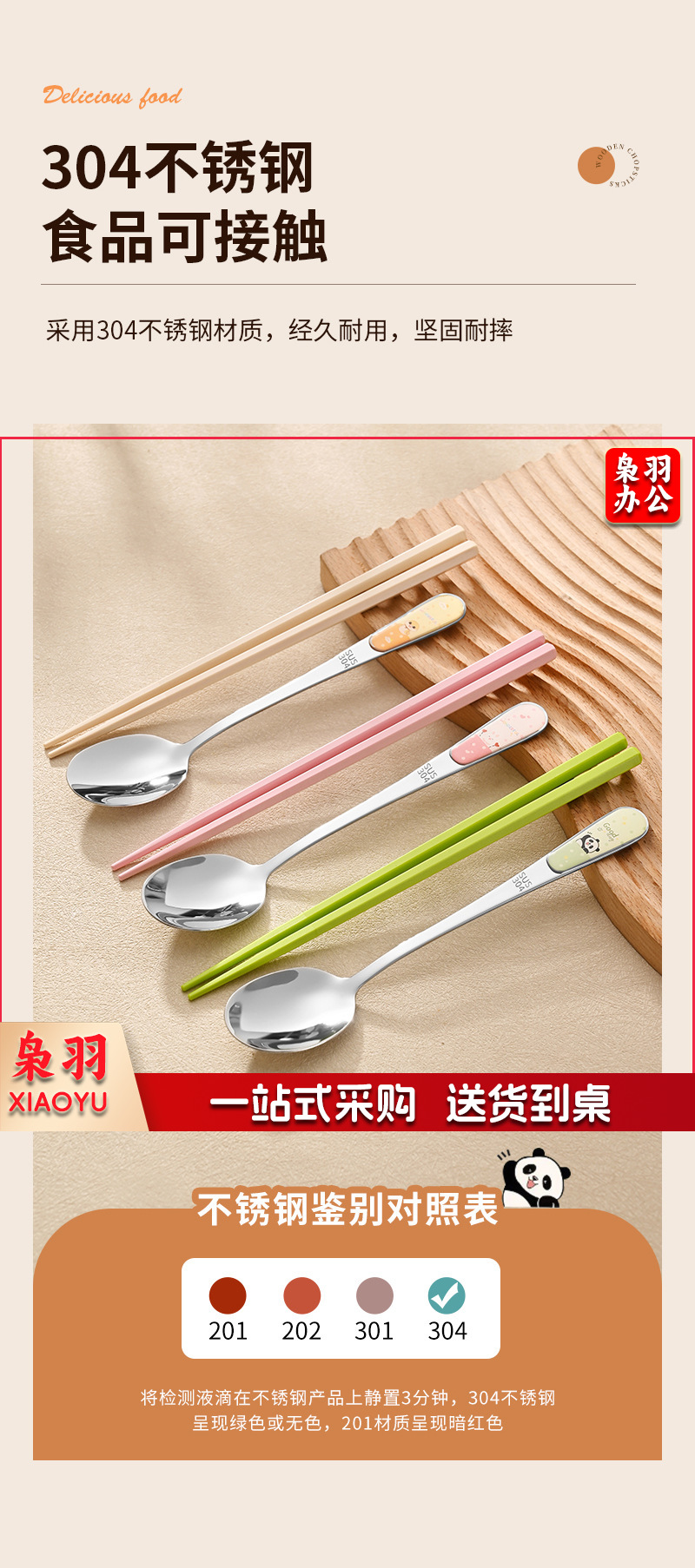 304不锈钢便携式餐具儿童学生勺子叉子筷子勺筷套装卡通( 熊猫绿(勺筷))