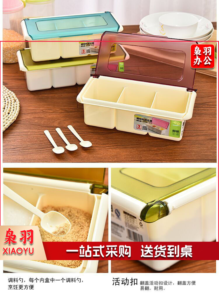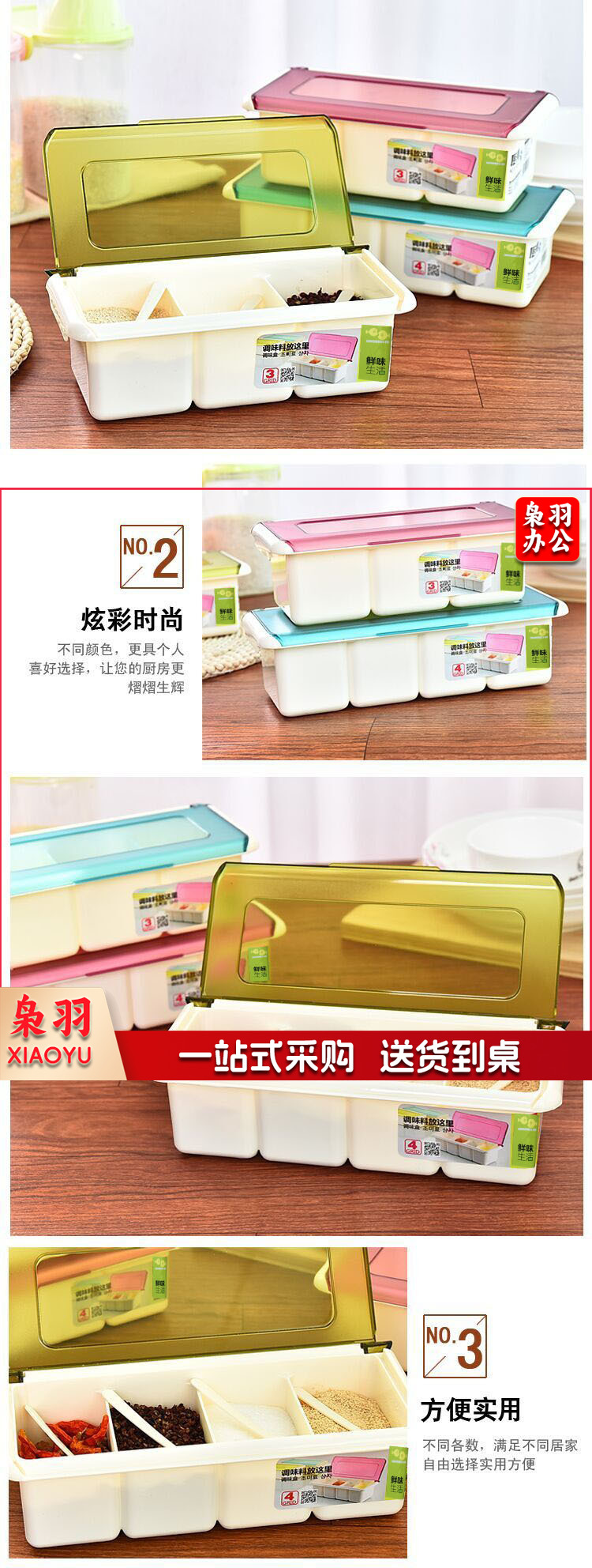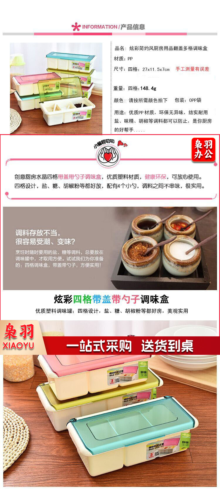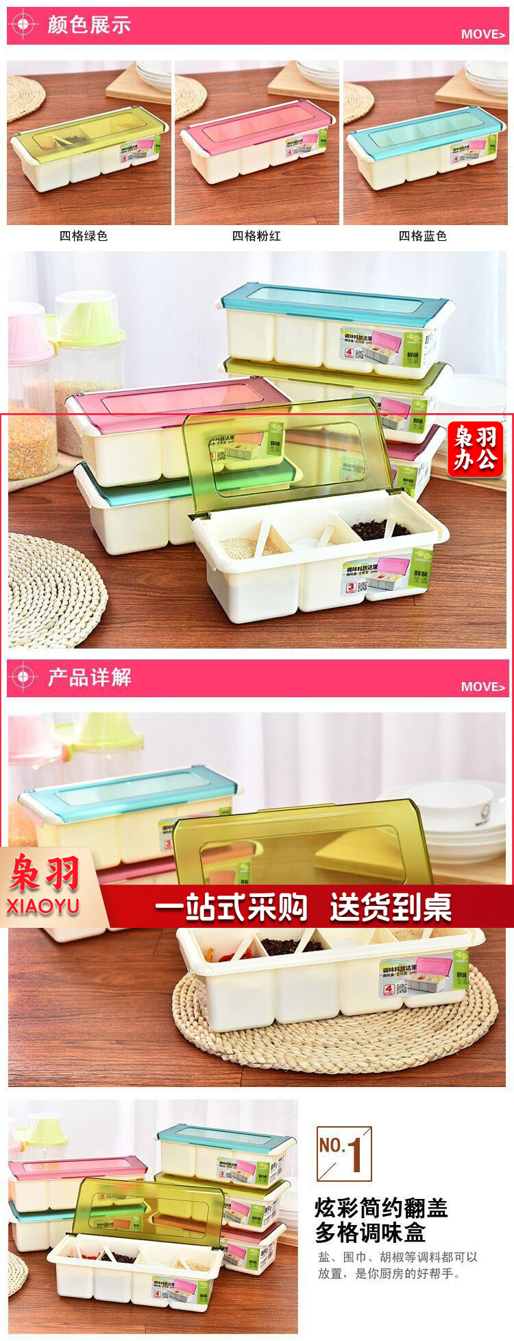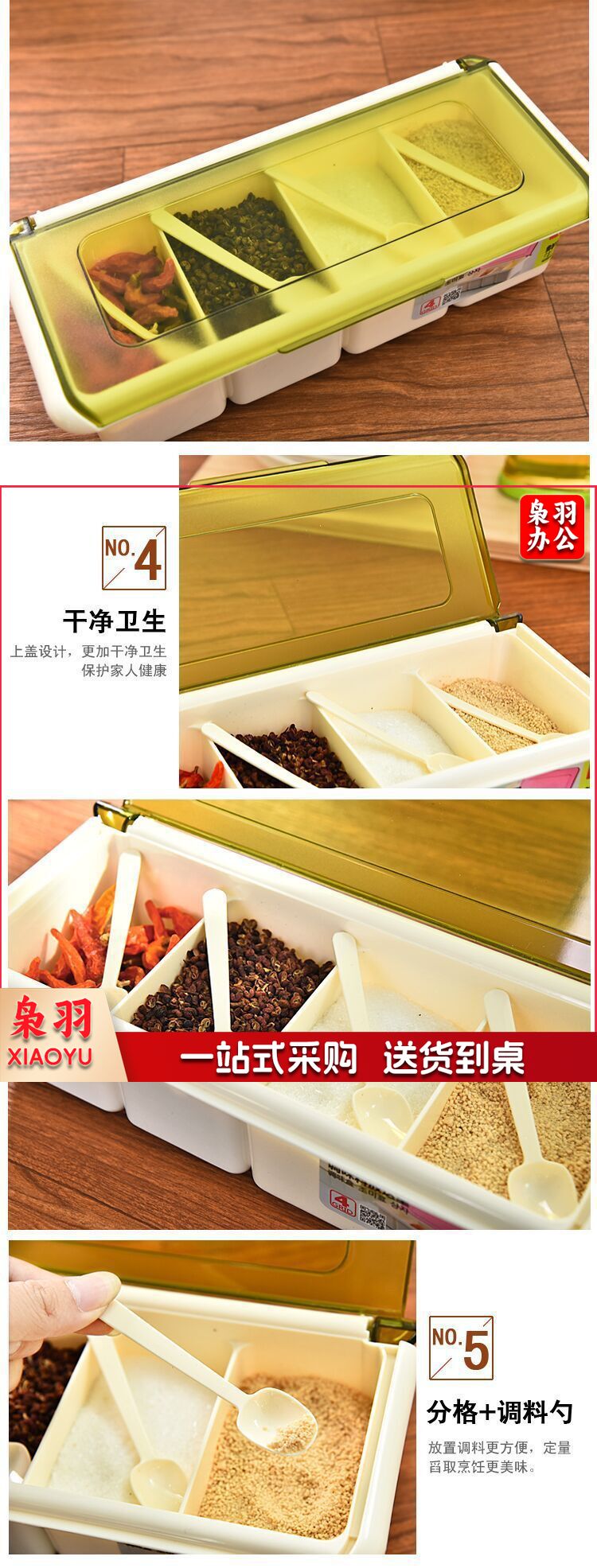 食品级塑料家用厨房用品调味瓶调料盒盐盒套装配勺四格厂家(4格彩色调味盒)