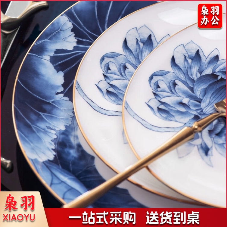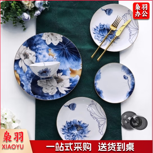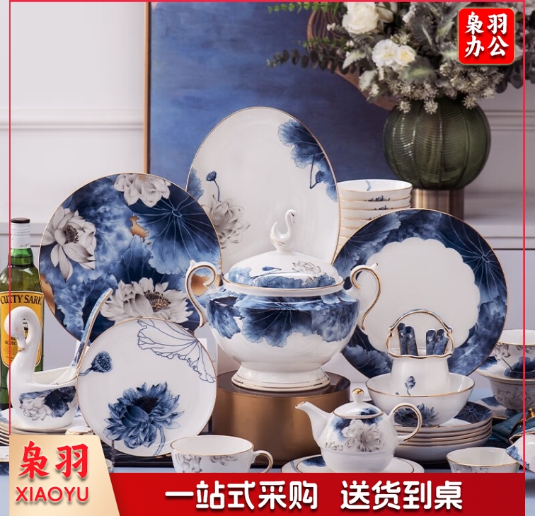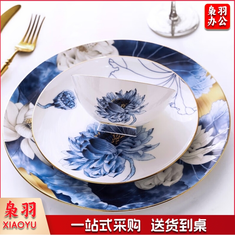 景德镇 陶瓷餐具中式轻奢酒店摆台骨瓷碗盘组合家用面碗汤碗