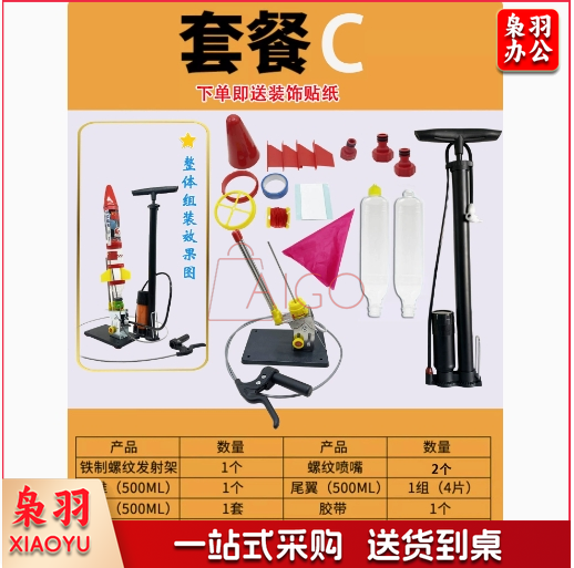 水火箭发射架带降落伞全套制作材料尾翼喷嘴儿童拼装滞空科学实验套装C500ml(打气筒带压力表)