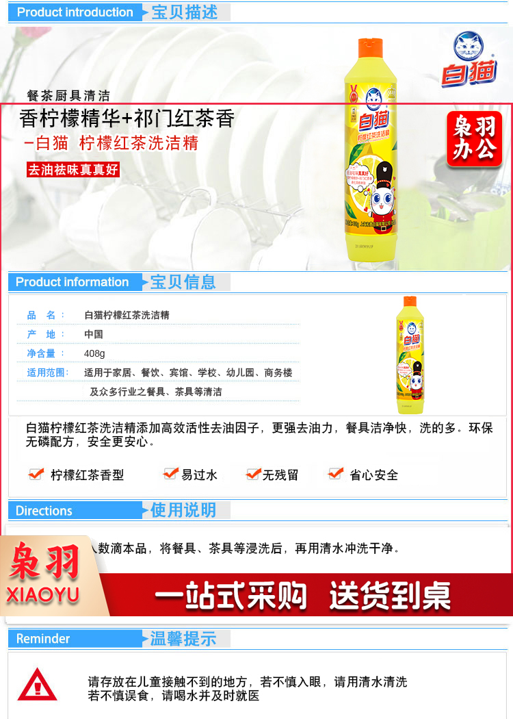白猫(BAIMAO)洗洁精408g 每箱30瓶