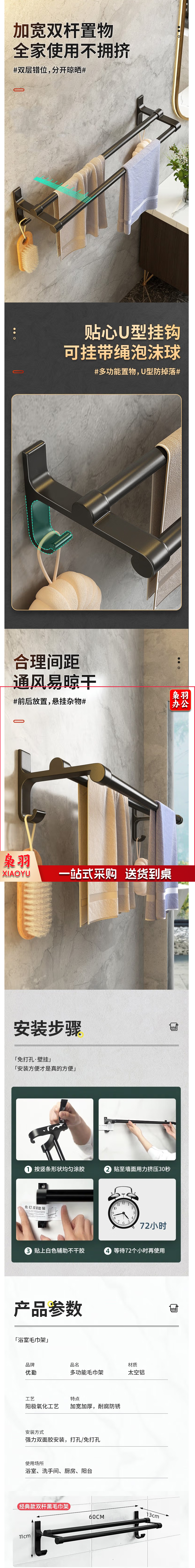 卫生间毛巾架免打孔浴室墙上双杆挂架浴巾收纳挂钩壁挂置物架 双杆黑-60cm