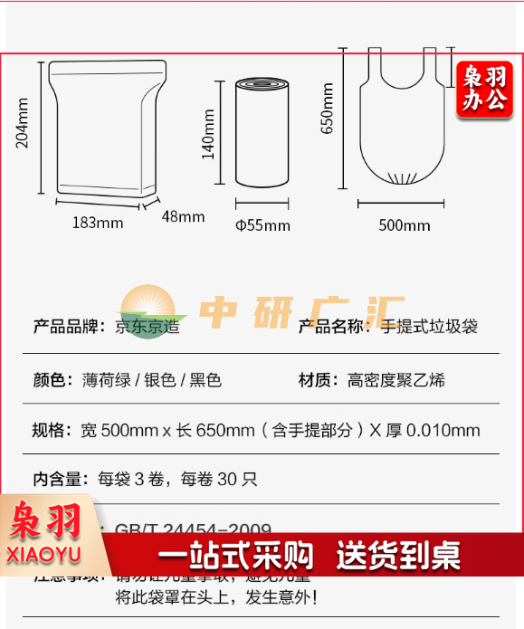 京东京造 大号50*65cm手提垃圾袋10um厚90只厨房客厅卫生间防刺破