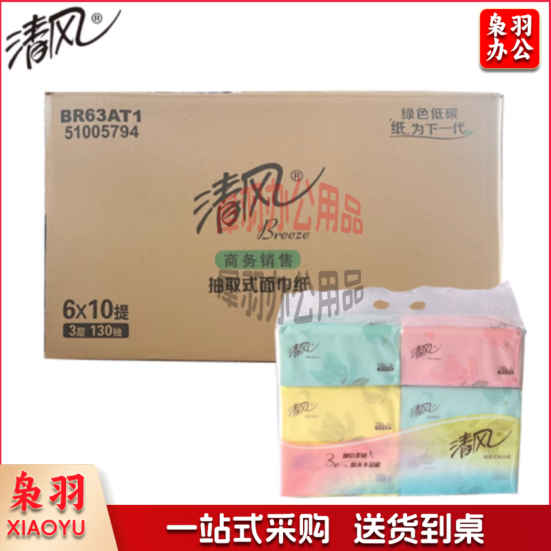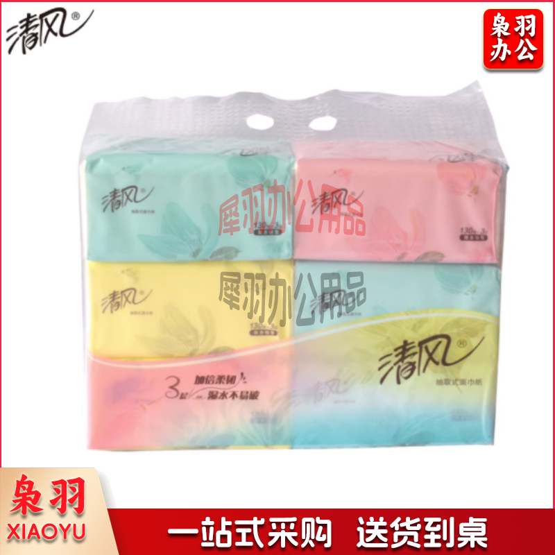 清风3层小规格130抽糖果色6包装抽取式面巾纸