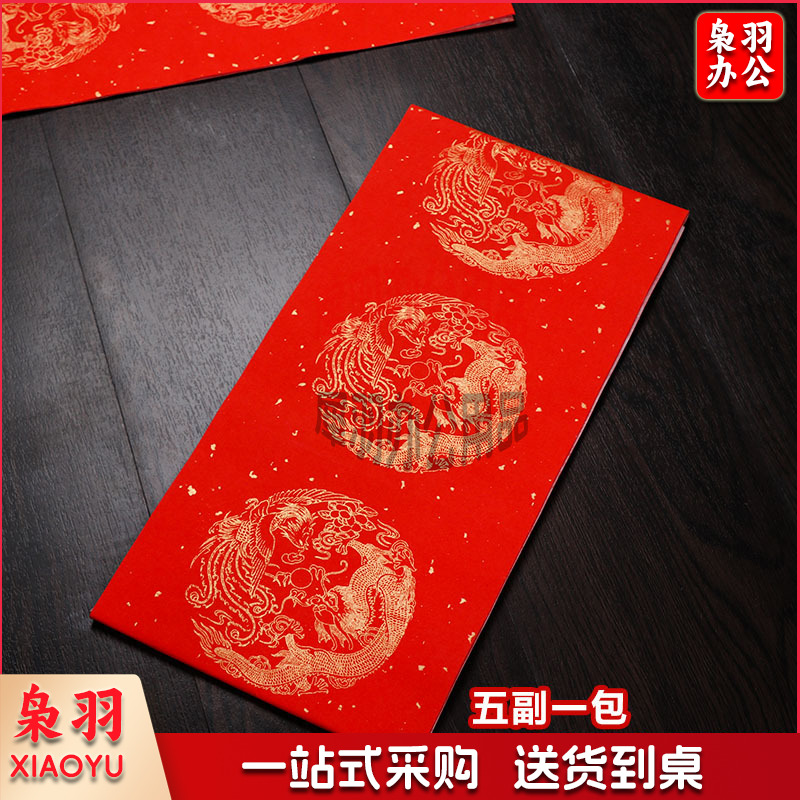 对联纸新款空白手写春联纸自写红纸万年红大红春联专用纸龙凤福字春节书法高档蜡染加厚宣纸 5副(七言23*138cm)
