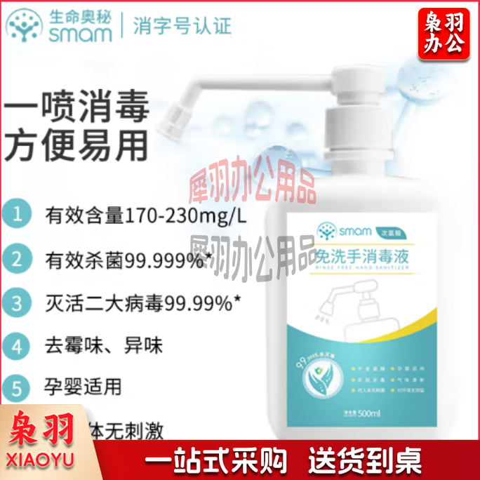 生命奥 秘免洗手消毒液500ml微酸性次氯酸消毒剂家用儿童洗手速干便携喷雾含氯消毒除菌液人体无刺激非84酒精