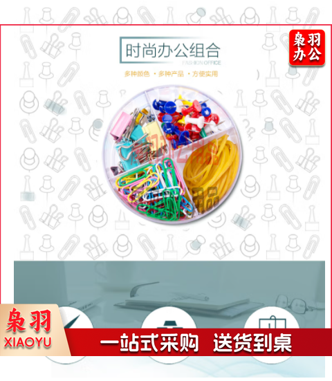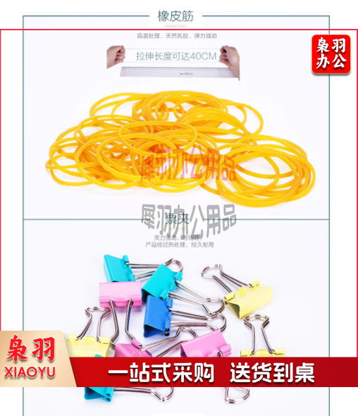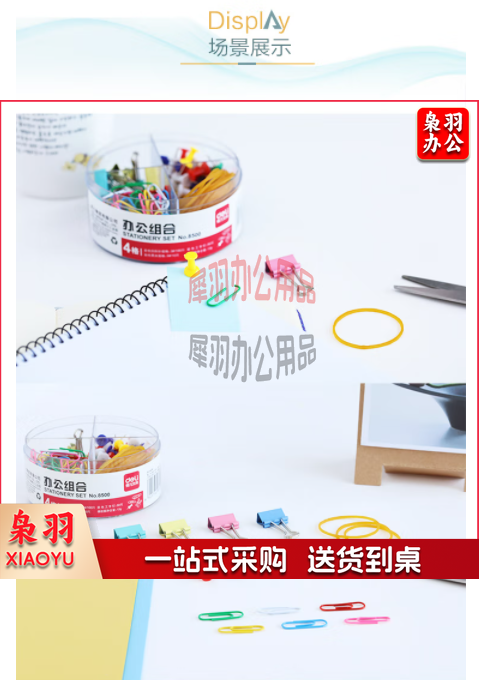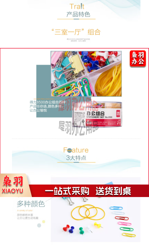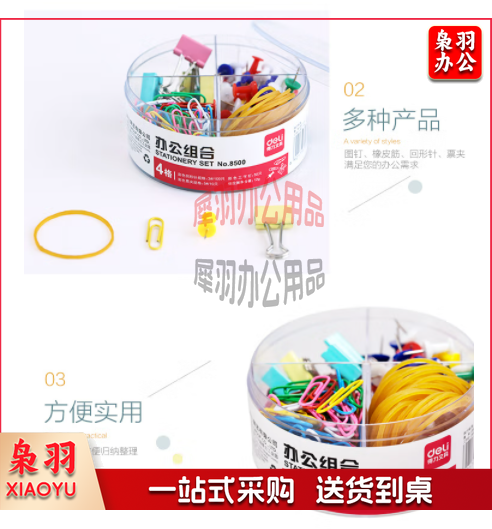 办公用品套装 得力(deli)四合一办公用品组合套装(19mm小号票夹10只+29mm回形针100只+工字钉50只+橡皮筋)/盒 8500