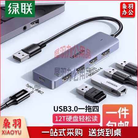 绿联 USB3.0分线器扩展坞01 高速4口集线器HUB拓展坞 适用笔记本电脑一拖多转换器转接头 Type-C供电口 0.15米 TJHX02281340053085