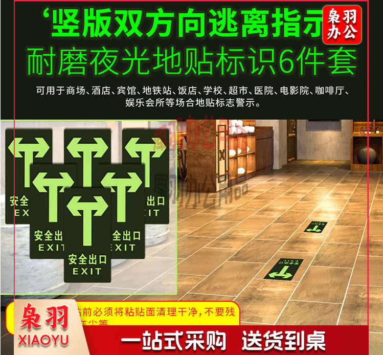 安全出口标识 夜光耐磨地贴消防疏散标识指示牌竖版双方向6片